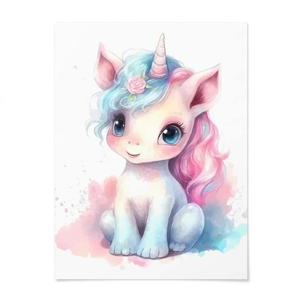 Sur la toile, on découvre une licorne blanche à la crinière rose et turquoise, rendue dans un style aquarelle délicat qui donne l’impression que les couleurs s’écoulent les unes dans les autres.