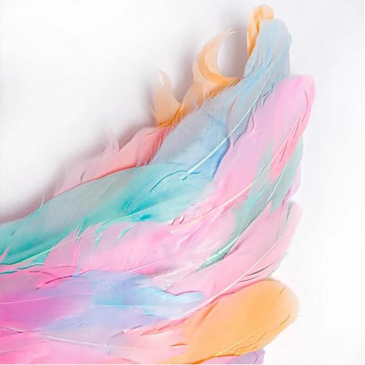 Les plumes sont disposées en couches superposées et affichent un mélange de teintes pastel absolument enchanteur : rose, violet, bleu ciel, vert menthe et doré se mélangent pour créer un effet arc-en-ciel très doux et lumineux.