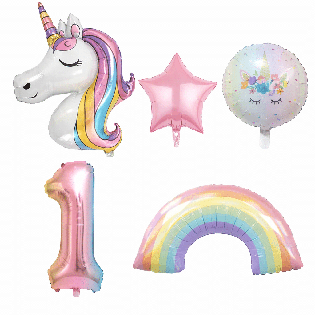 Sur l’image, on découvre un ensemble complet de ballons assortis : une grande tête de licorne avec sa crinière pastel, un arc-en-ciel aux couleurs douces, deux ballons ronds décorés de motifs licorne aux tons nacrés, et une étoile rose.