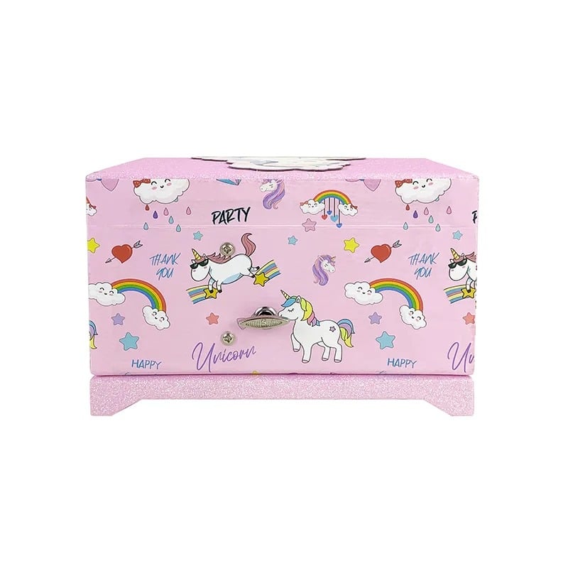 Tout l’extérieur de la boite a bijoux musicale licorne rose est recouvert d’un habillage rose vif orné de motifs licornes, arcs-en-ciel et étoiles colorées, ce qui lui donne un aspect vraiment festif et plein de fantaisie.