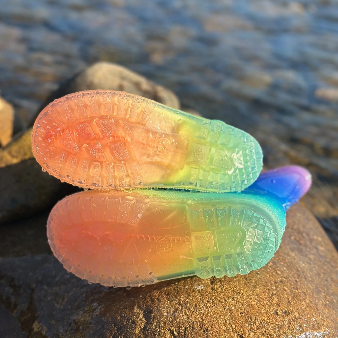 Le look transparent et brillant du caoutchouc laisse apparaître les couleurs avec encore plus d’intensité, ce qui renforce l’effet arc-en-ciel si caractéristique de cette botte de pluie licorne arc en ciel enfant.