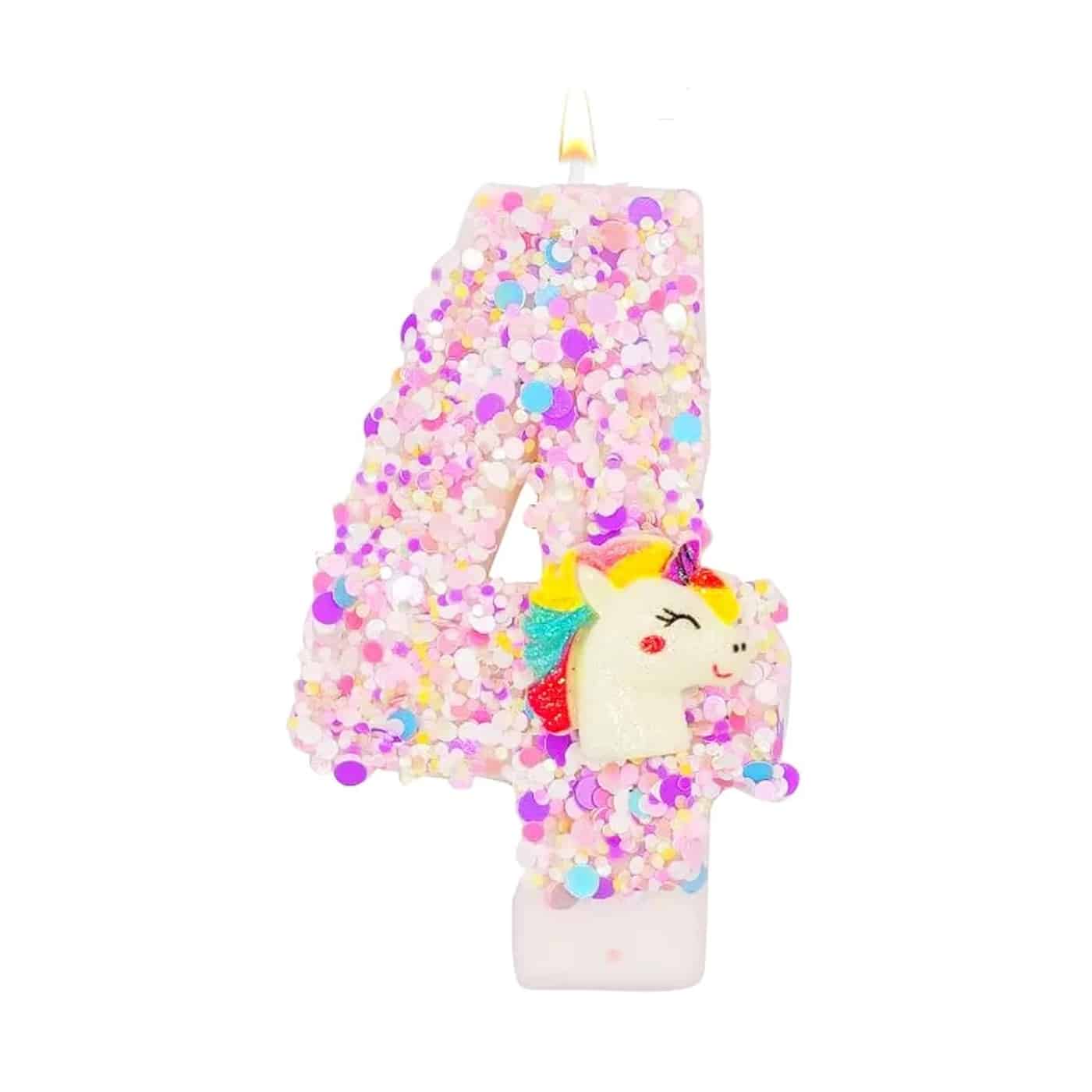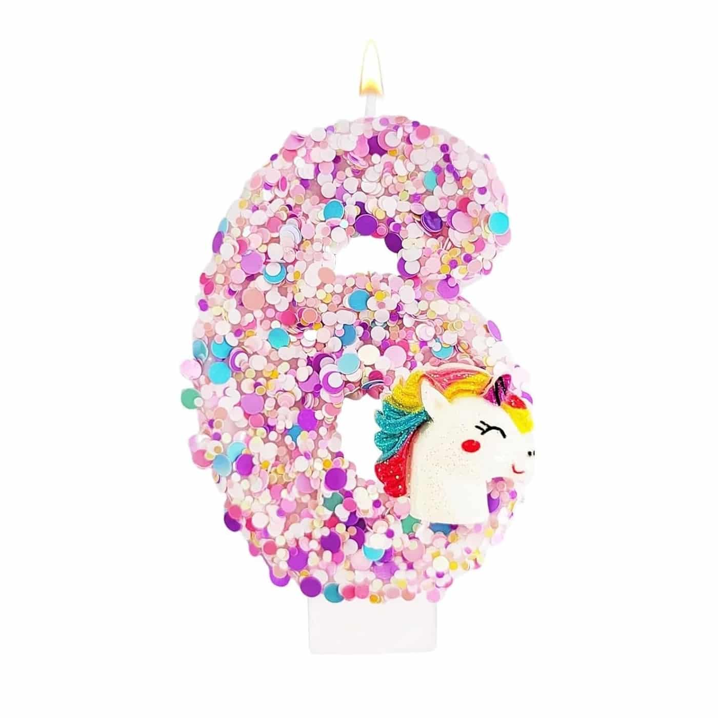 Une bougie chiffre scintillante qui transforme chaque gâteau en véritable instant féerique. Paillettes roses et dorées, tête de licorne miniature : un détail magique qui vole la vedette avant même d’être allumée.