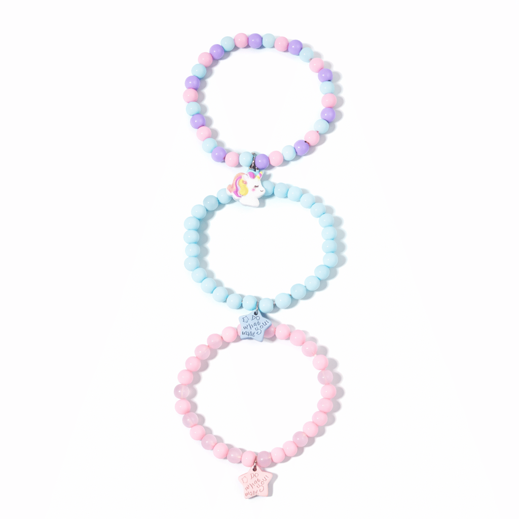 Trois bracelets enchanteurs aux perles pastel et pendentifs licorne ou étoile, pour un poignet tout en féerie. À porter ensemble ou à partager, la magie se glisse partout.