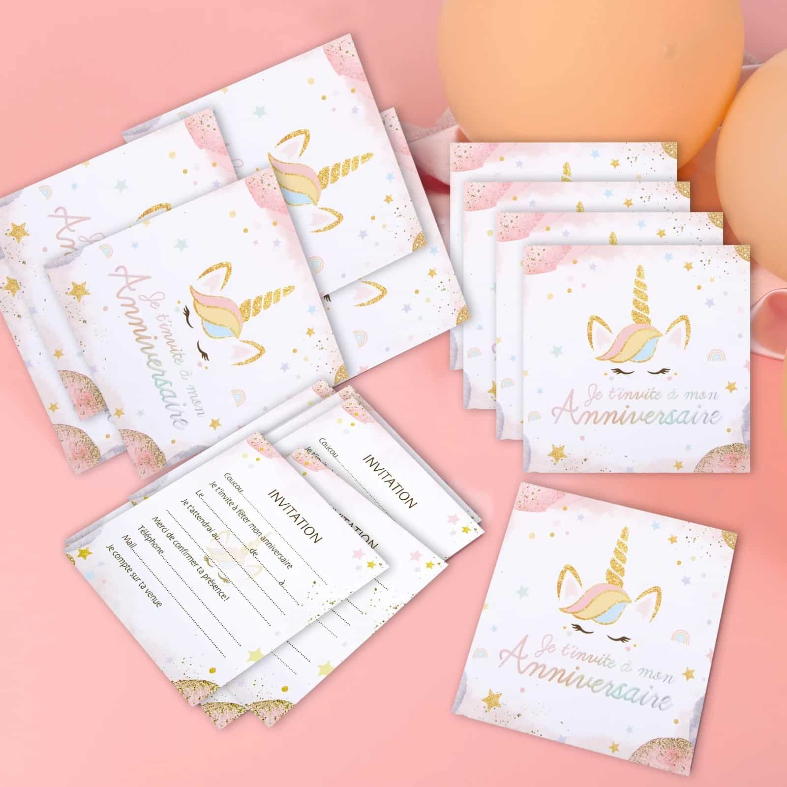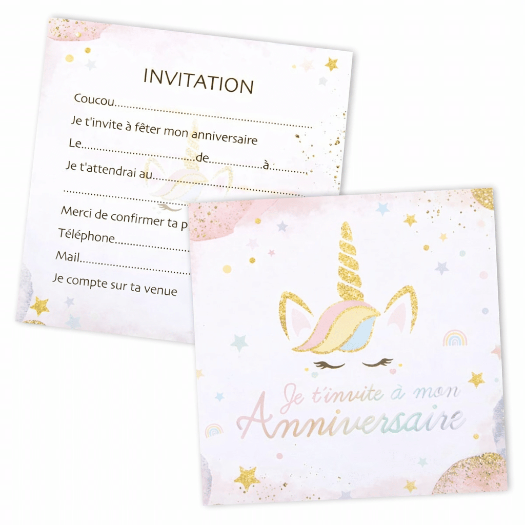 Le lot de 12 cartes d’invitation anniversaire licorne est idéal pour une fête avec les copains et copines, sans avoir à en commander plusieurs fois.