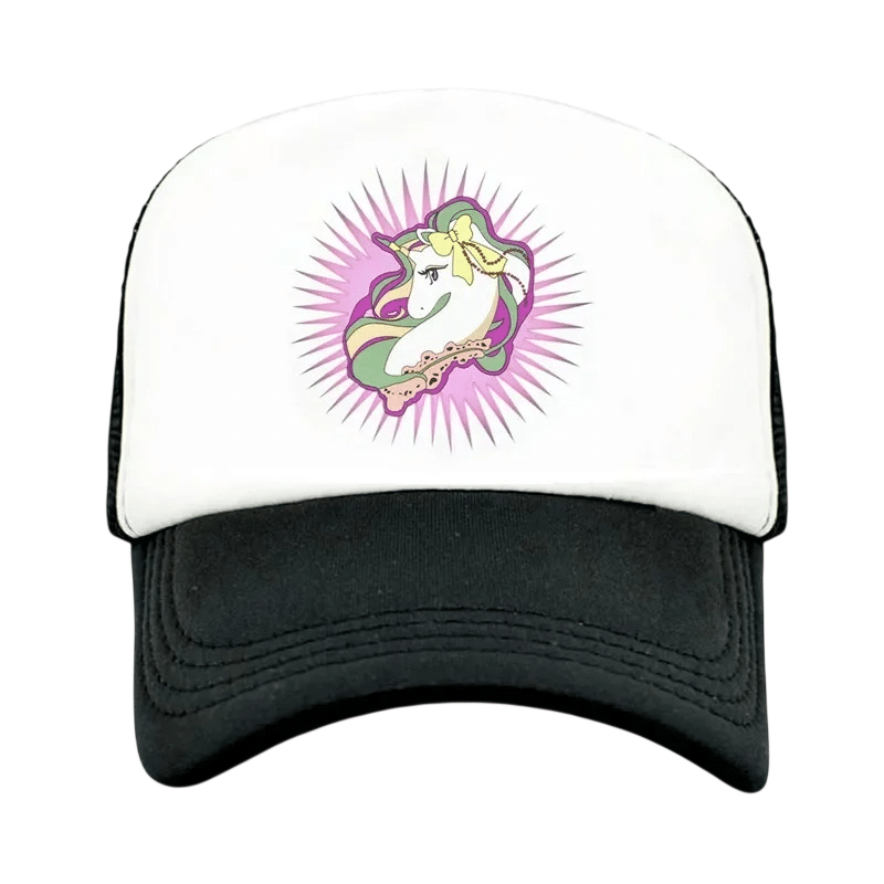 Au cœur de la casquette, une licorne colorée aux tons verts et dorés se détache sur un fond de rayons roses, comme une petite explosion de magie.