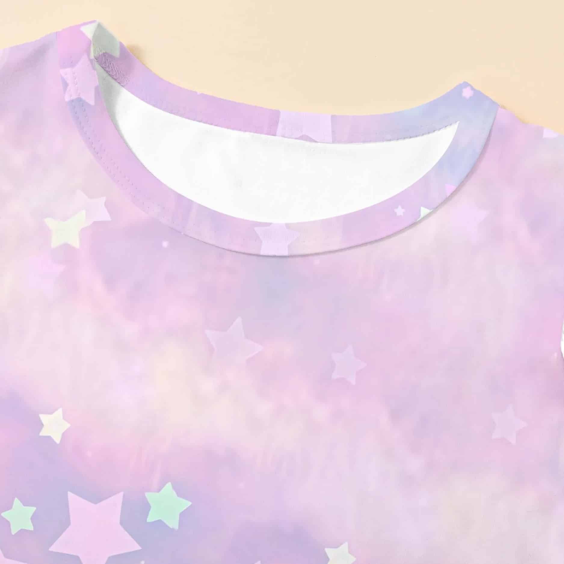 Les deux personnages semblent flotter sur un nuage, entourés d’étoiles scintillantes sur un fond dégradé rose et violet vraiment magique.
