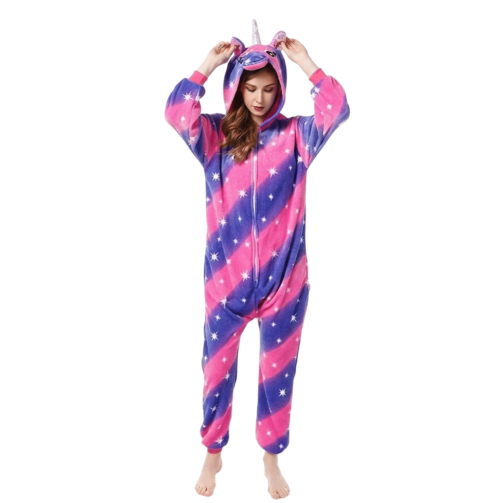 Ce costume licorne pyjama adulte rose et violet mélange confort du quotidien et fantaisie assumée, pour vivre chaque nuit comme une aventure magique.
