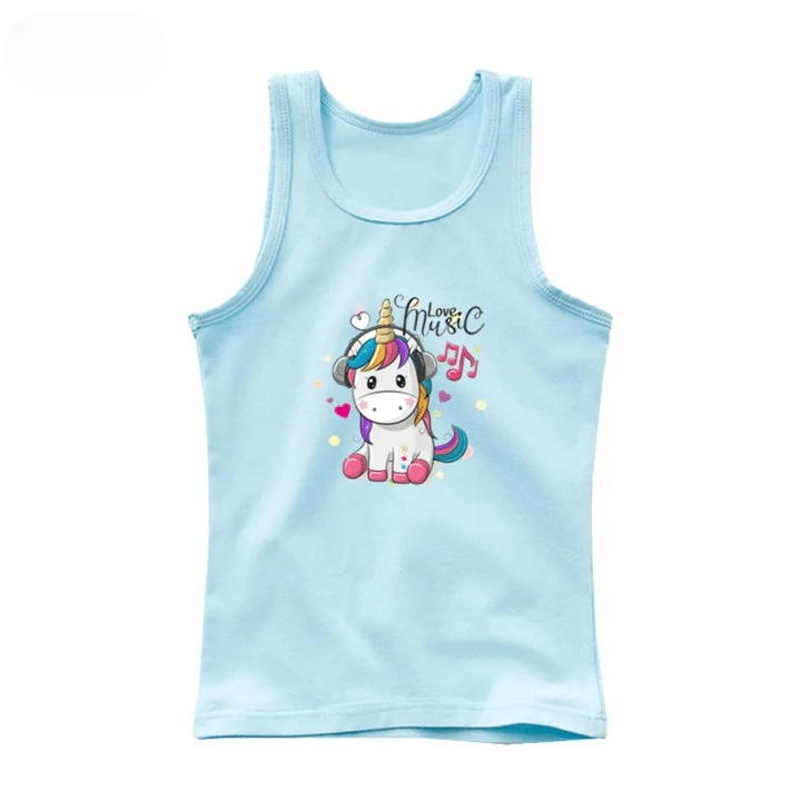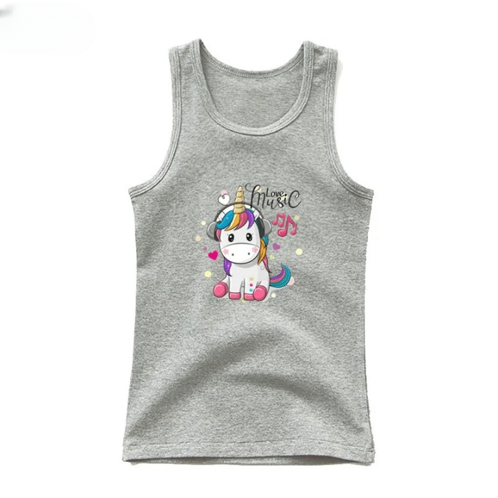 Le débardeur licorne fille est disponible dans trois coloris : rose, gris et bleu. Le modèle gris visible sur l’image met particulièrement bien en valeur les couleurs vives du motif.