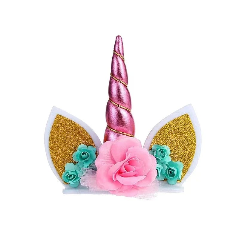 Sur le dessus, une corne dorée brillante s’élève fièrement, entourée de deux petites oreilles dorées avec un intérieur rose.