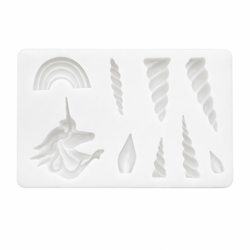 Le moule propose plusieurs formes différentes réunies sur une seule plaque : une tête de licorne complète avec sa crinière, des cornes torsadées de différentes tailles, des oreilles pointues, ainsi qu’un arc-en-ciel.