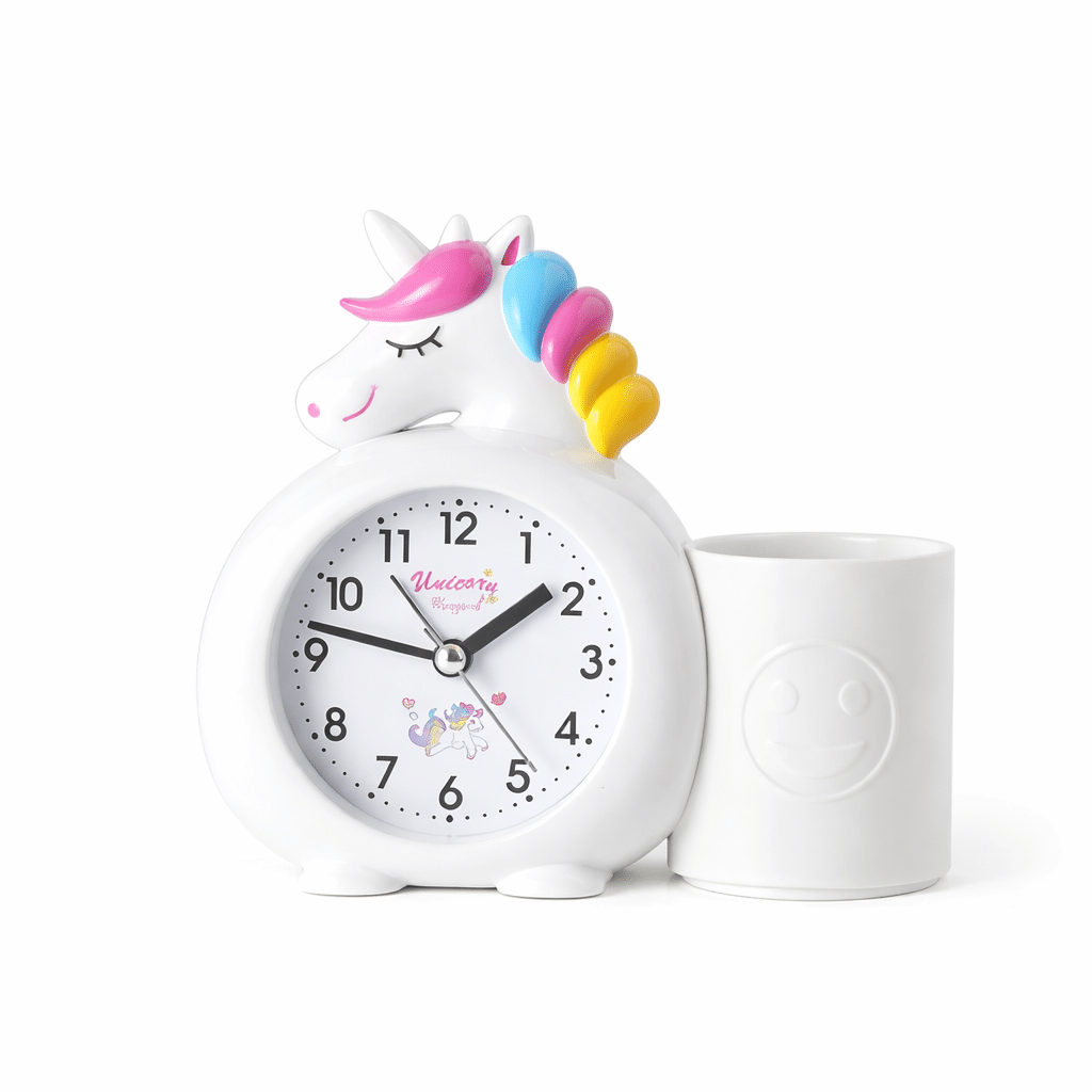 L’horloge licorne enfant avec pot à crayon mêle utilité du quotidien et magie colorée dans un format compact et adorable.