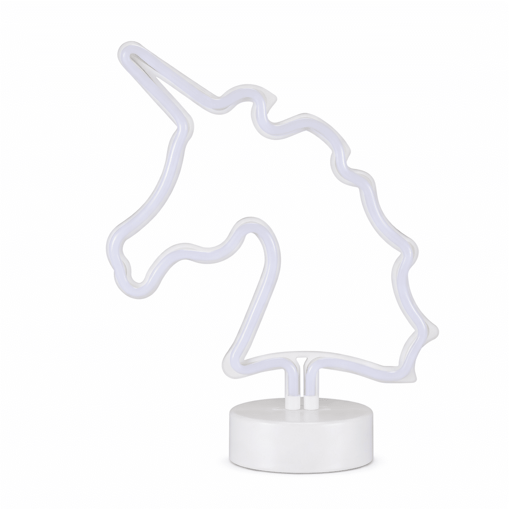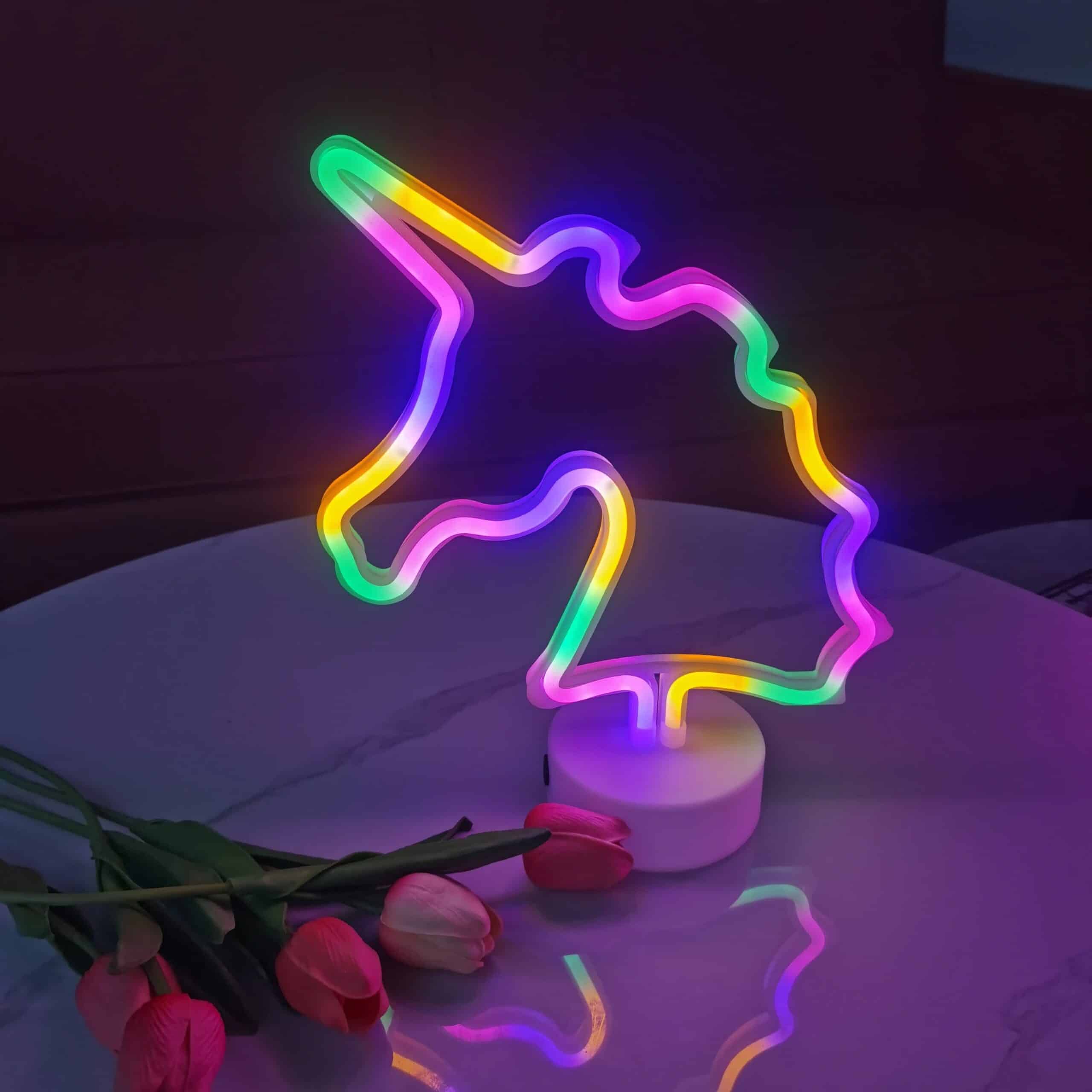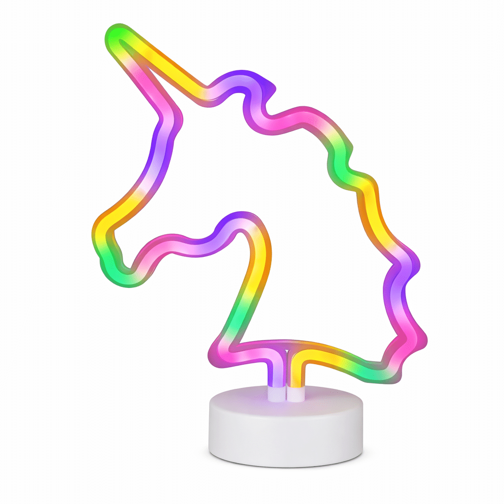 Le contour néon multicolore donne une impression de légèreté et de magie, comme si la licorne brillait d’elle-même dans l’obscurité. C’est un objet qui attire le regard et qui met de bonne humeur rien qu’en le regardant.