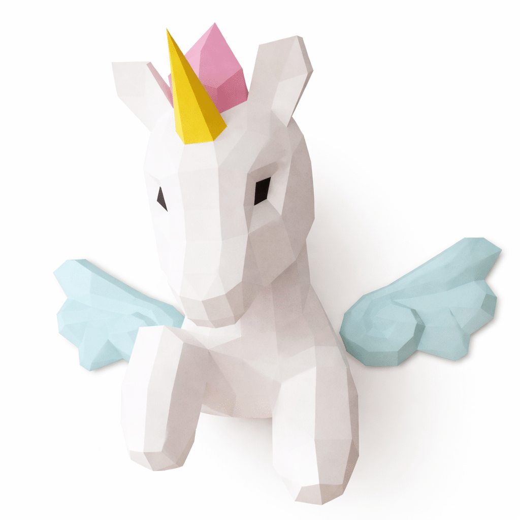 Le résultat final est une licorne blanche aux formes angulaires et précises, avec une corne dorée, une crinière rose et des petites ailes bleu pastel.
