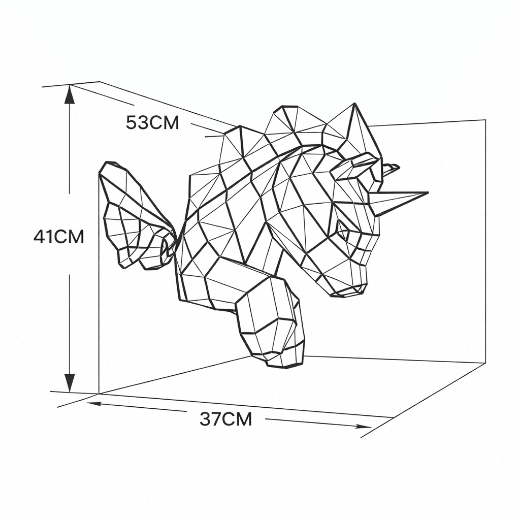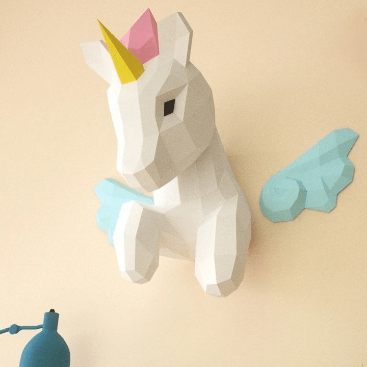 Chaque face est taillée dans du carton solide, ce qui donne à la licorne terminée une allure sculpturale, presque comme une petite statue posée sur une étagère.