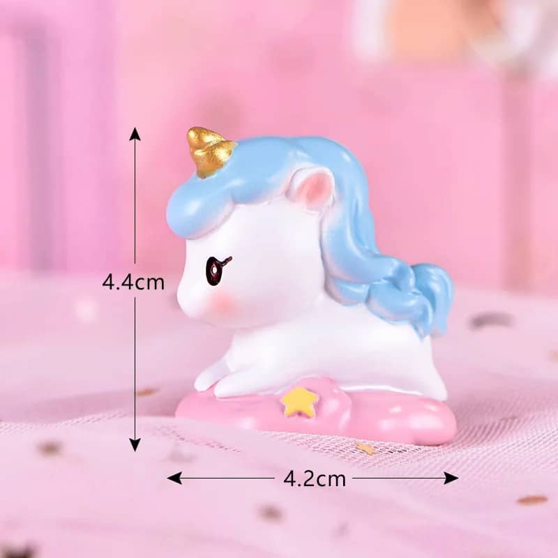 La mini figurine licorne est disponible en plusieurs versions : bleue couchée, bleue debout, rose couchée ou rose debout.