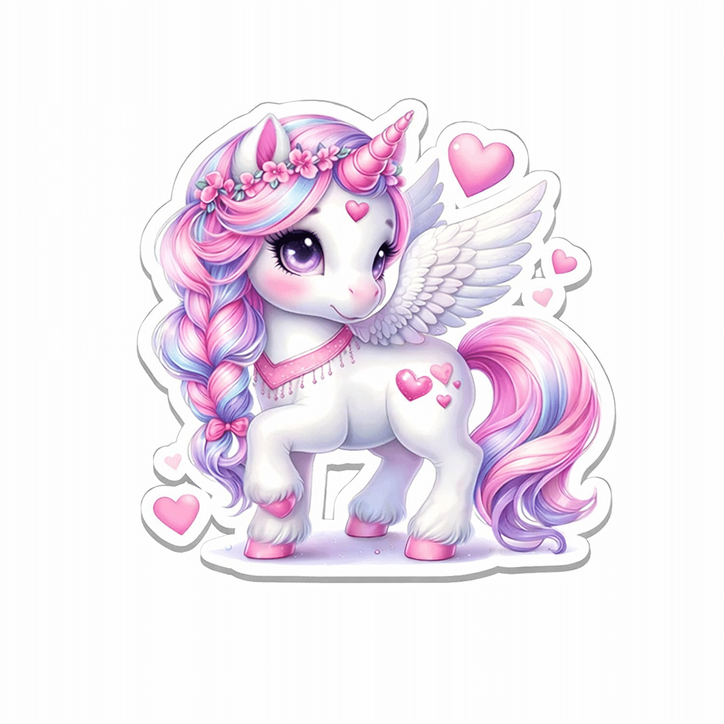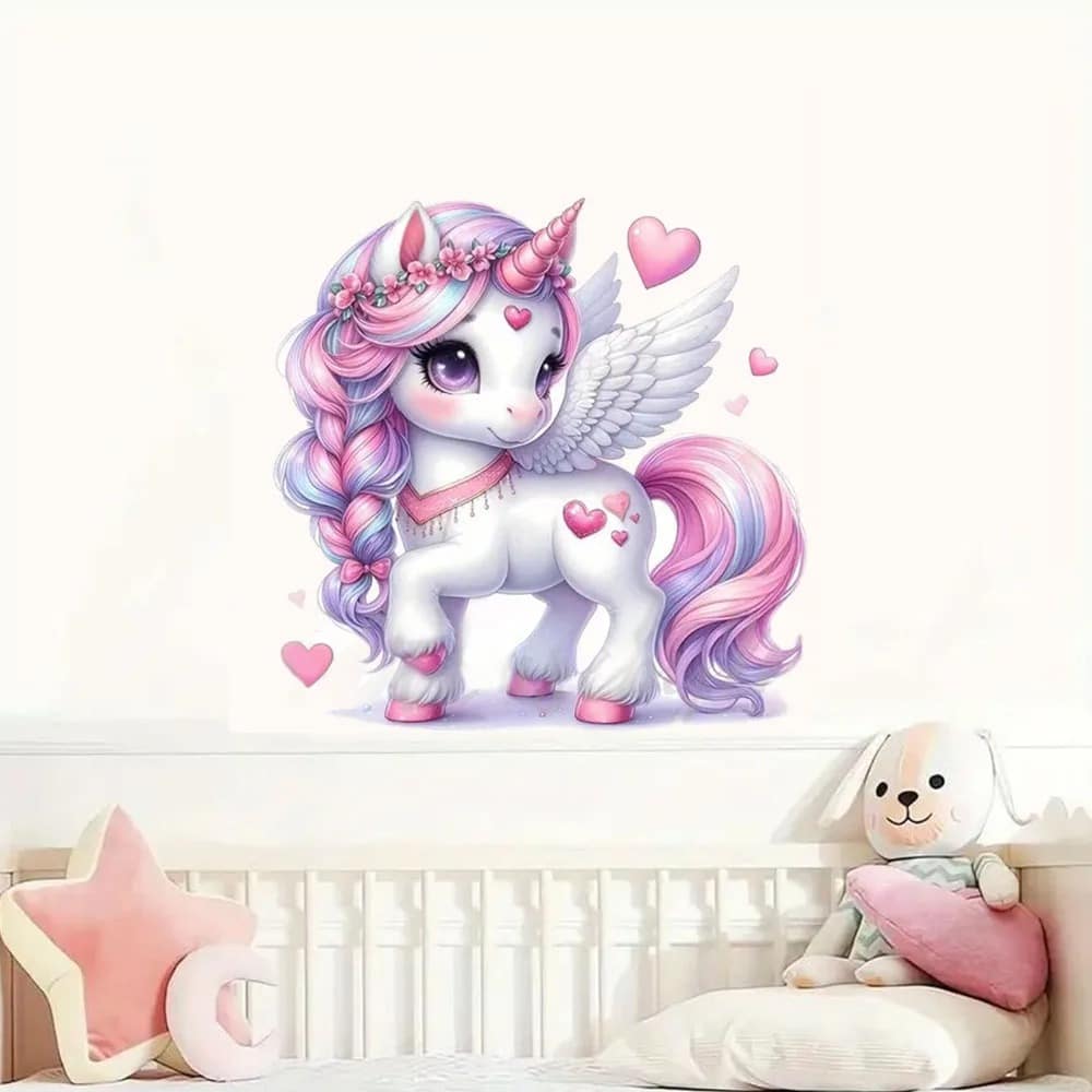 . Sur fond blanc, une adorable licorne aux ailes déployées prend vie avec ses couleurs douces et lumineuses : une crinière rose et violette tressée, des sabots roses, et un petit cœur rose sur le flanc.