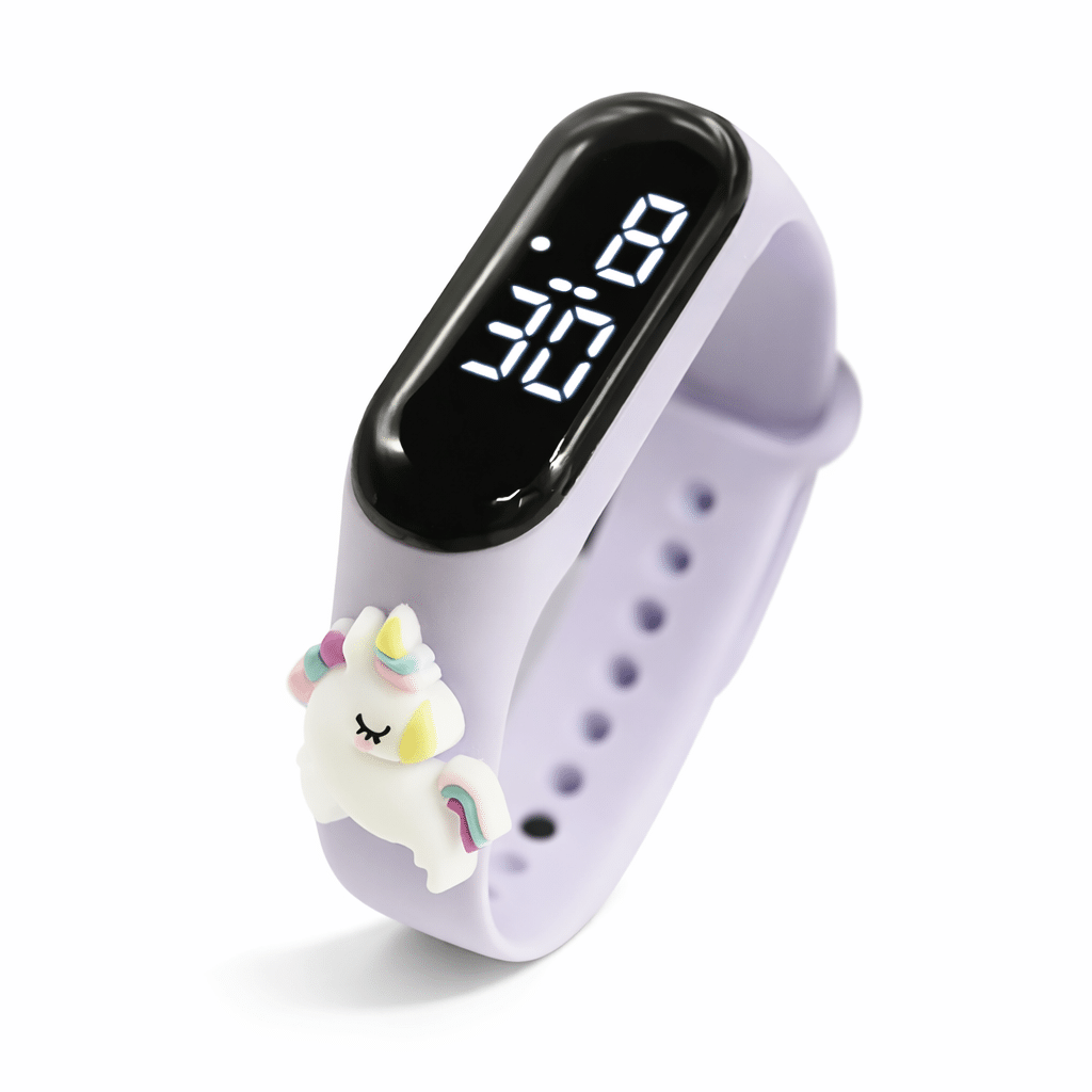 Une montre digitale pleine de magie, ornée d’une adorable figurine licorne 3D aux couleurs pastel. Bracelet lilas ultra-doux et affichage lumineux : l’heure se lit avec un sourire.
