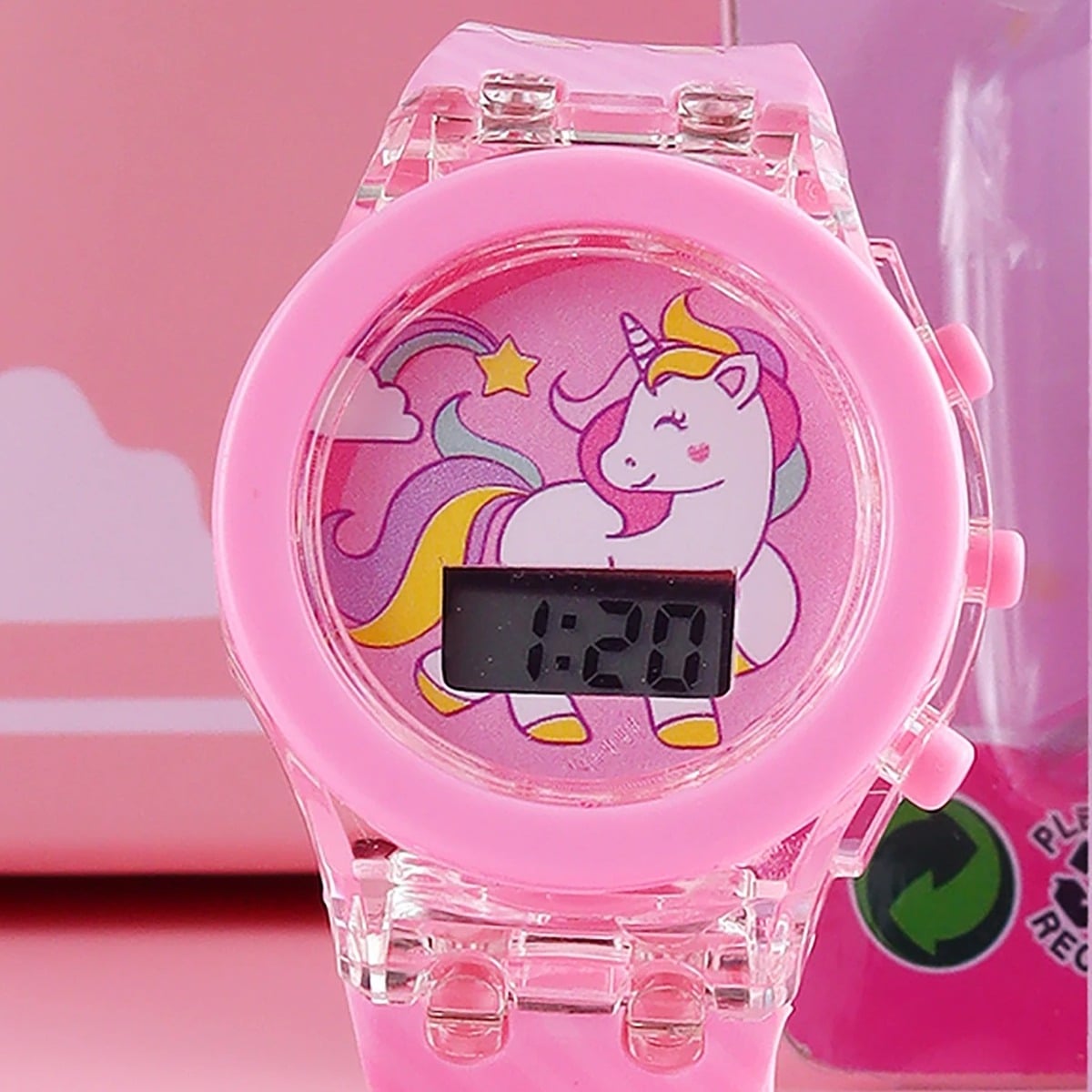 Le cadran est décoré d’une jolie licorne blanche aux couleurs pastel, avec une crinière arc-en-ciel et un fond rose doux.