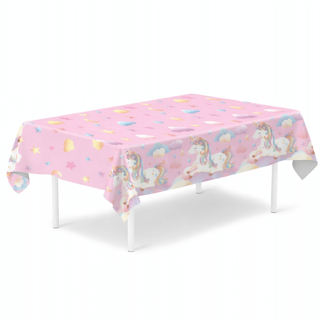 La nappe licorne rose transforme instantanément une table ordinaire en un vrai coin de fête magique.