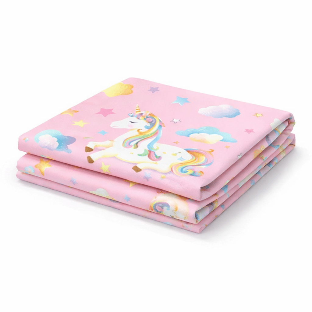 Le fond rose pastel est parsemé de motifs colorés et enchanteurs : une licorne blanche aux crins arc-en-ciel trône au centre, entourée de nuages bleus, d’étoiles jaunes et multicolores, et de petits détails qui rappellent un univers doux et féerique.