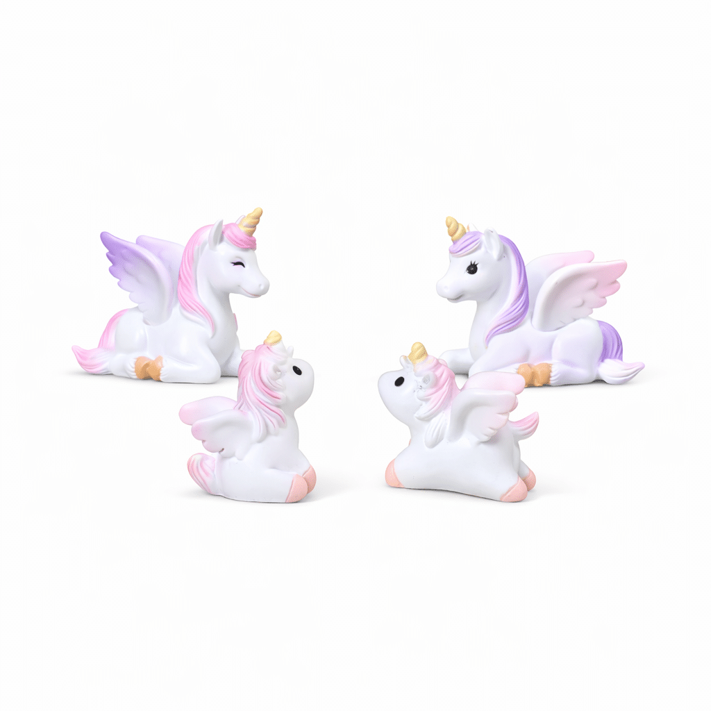 Quatre petites licornes ailées en résine aux teintes pastel douces, entre 3 et 5 cm de pur émerveillement. Parfaites pour ensorceler un terrarium, un gâteau ou une vitrine de collection.