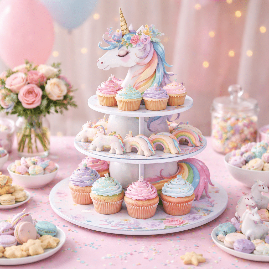 Ce présentoir cupcake licorne transforme instantanément une table de fête en un vrai décor de conte de fées.