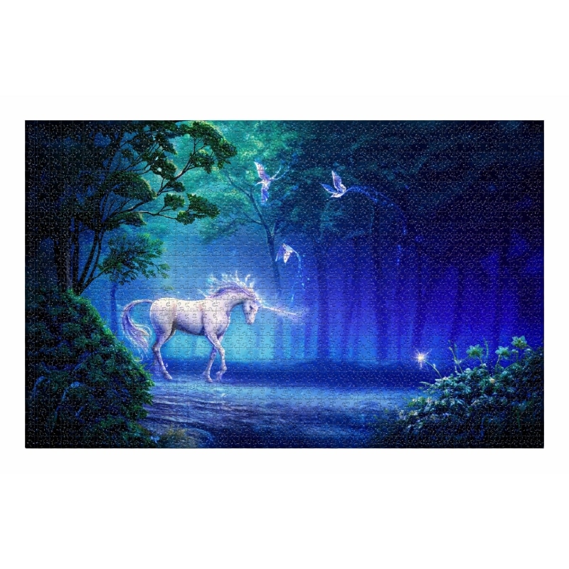Le puzzle 1000 pièces licorne adulte t’invite dans une forêt enchantée baignée de lumières bleues et vertes, où une licorne blanche lumineuse avance paisiblement au cœur des arbres.