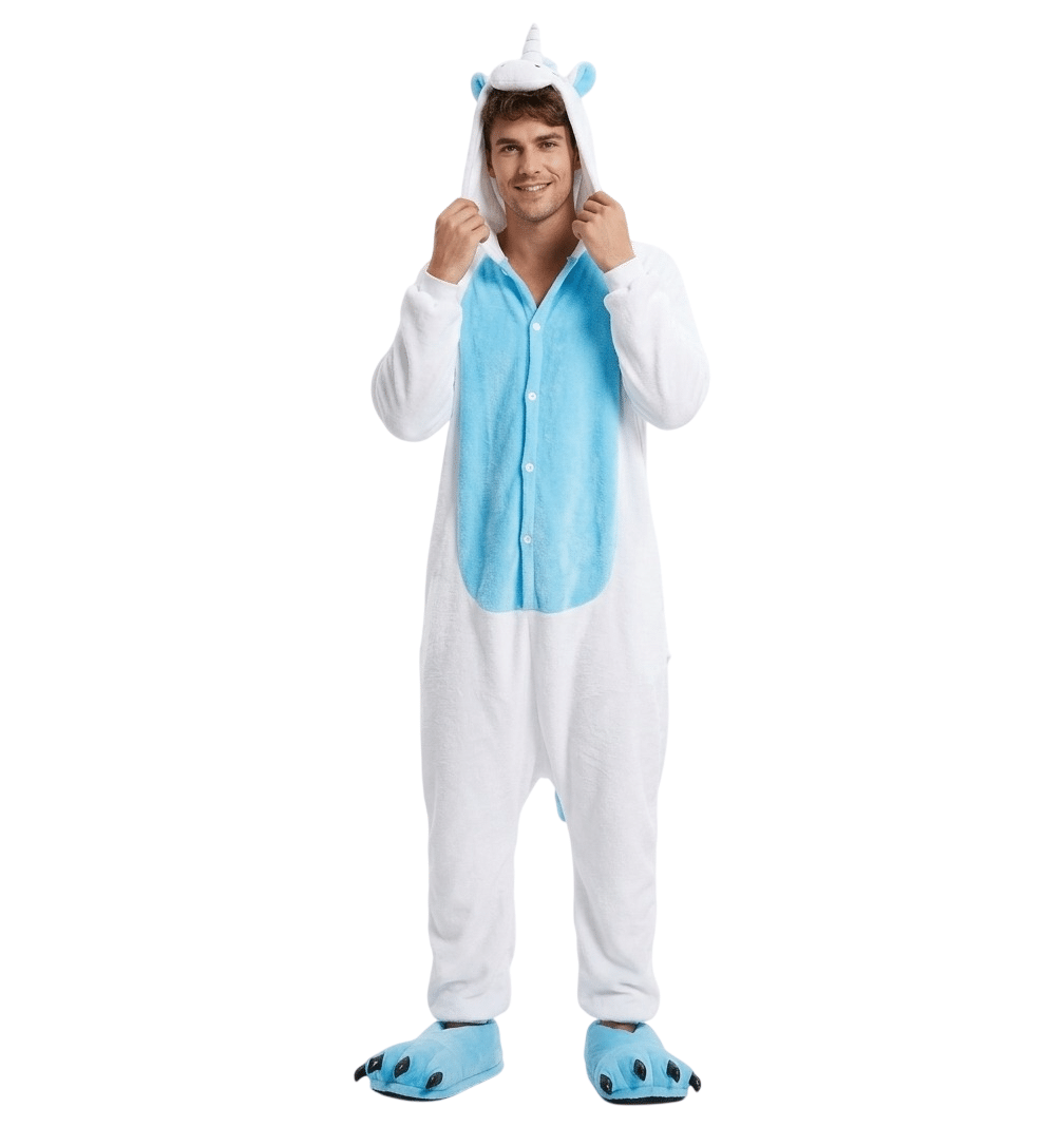 Ce pyjama homme licorne bleu et blanc te transforme instantanément en licorne blanche dès que tu l’enfiles.
