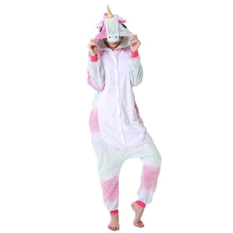 Ce pyjama licorne femme rose et blanc est une combinaison une pièce, ce qui veut dire qu’il couvre tout le corps d’un seul tenant, des pieds jusqu’à la tête.