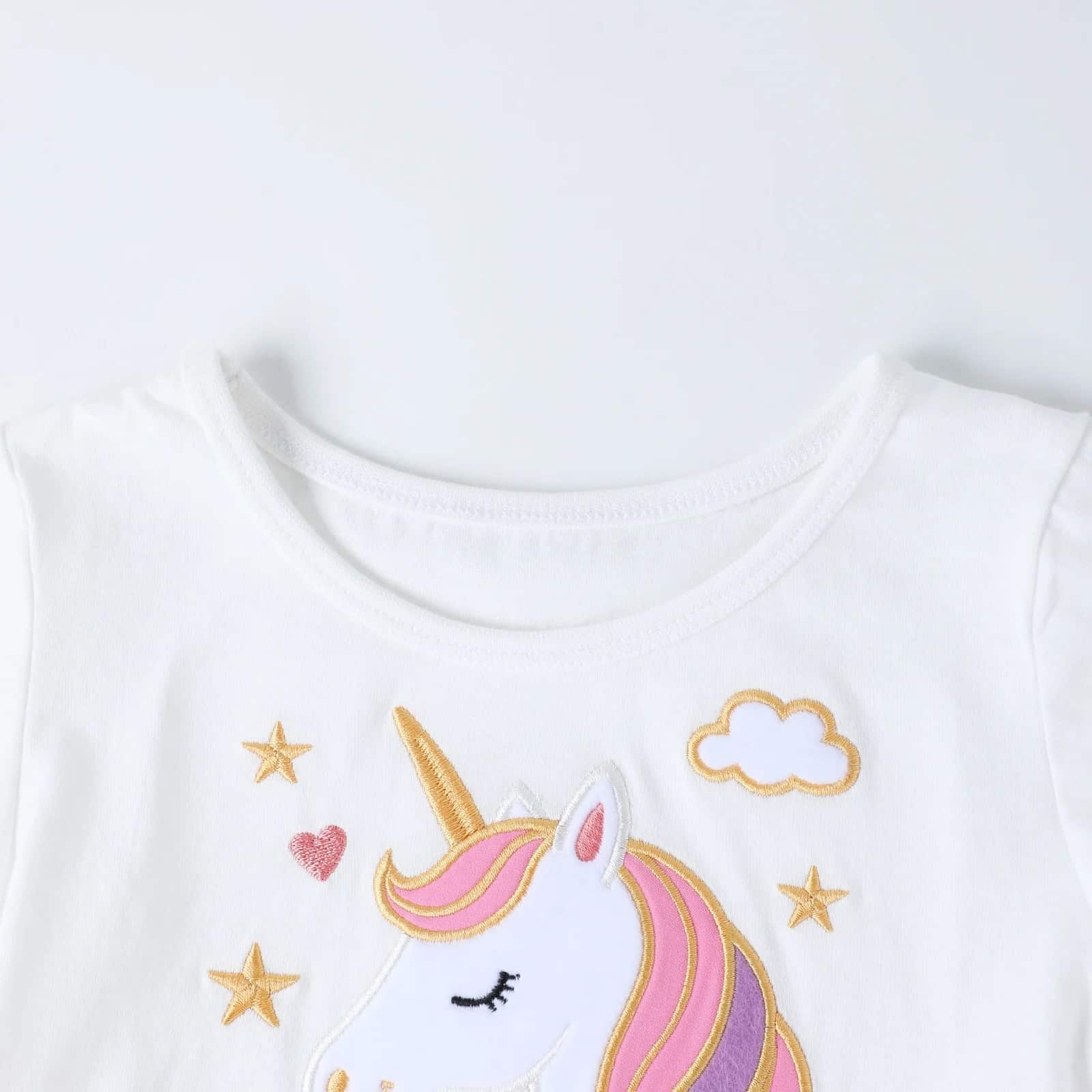 La licorne imprimée sur le haut est pleine de détails adorables : une crinière rose et dorée, une corne arc-en-ciel, des étoiles et des petits cœurs qui l’entourent.