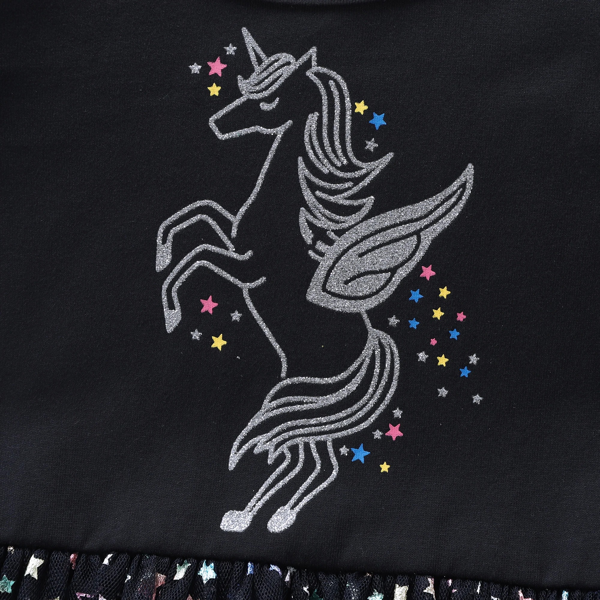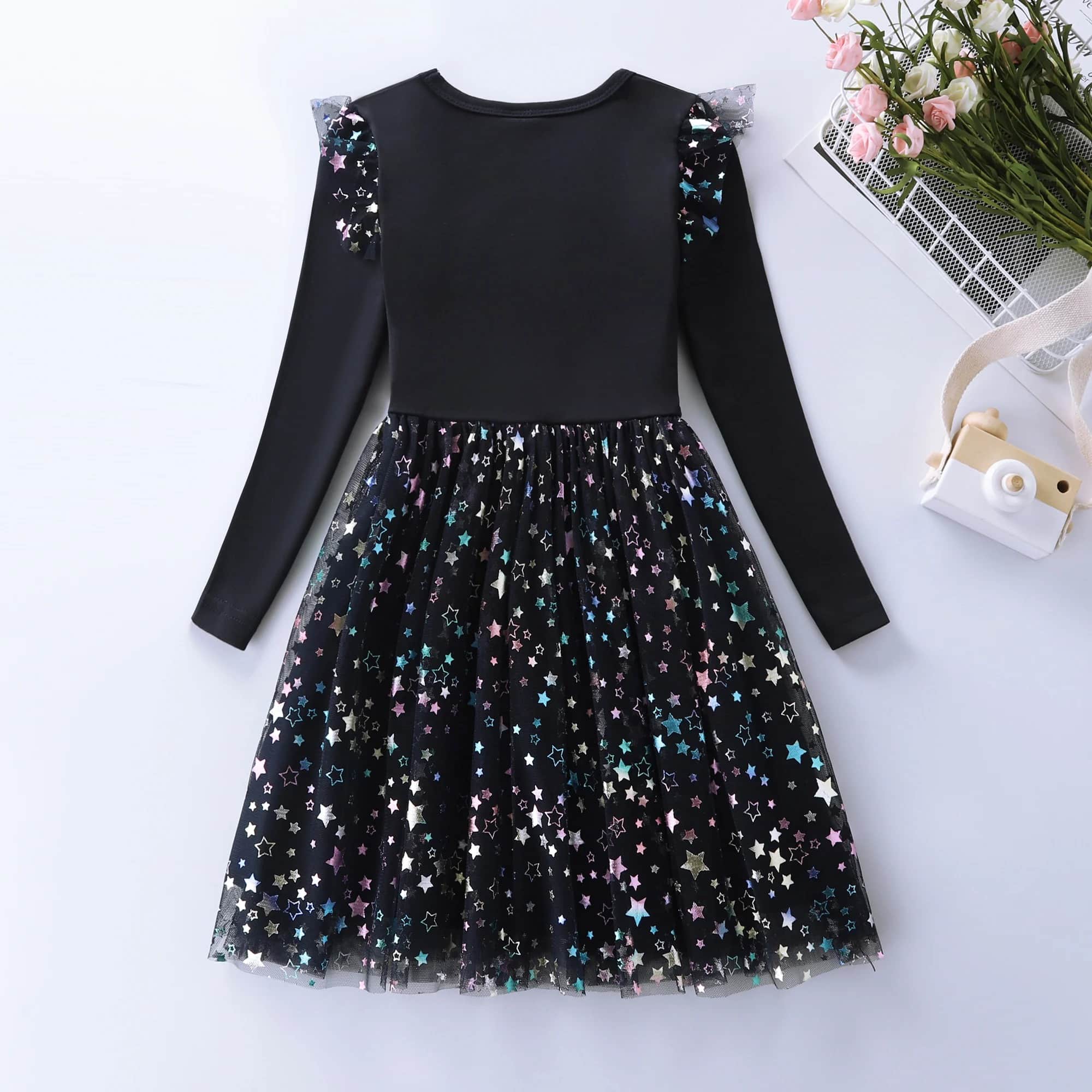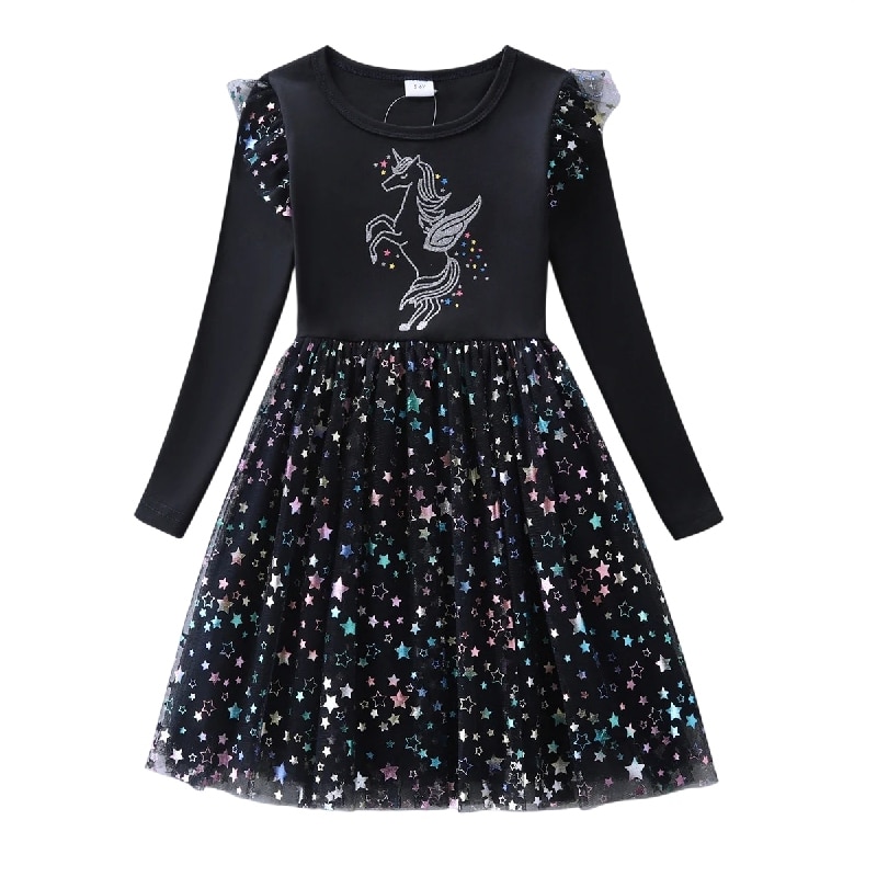 Cette robe noire licorne enfant avec étoiles, c’est une tenue qui donne envie de tournoyer sur elle-même, encore et encore, juste pour voir la jupe s’envoler.