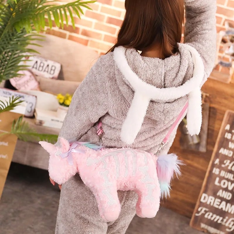 Un petit nœud pastel orné le cou, ajoutant une note girly et soignée. Sur le corps de la licorne, on distingue un motif brodé en lettres blanches, qui renforce le côté fantaisie et original du sac.