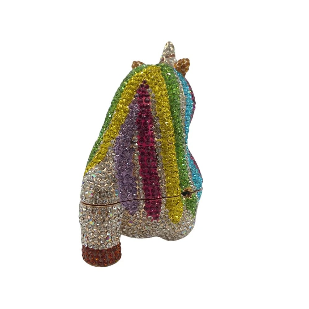Les détails sont vraiment soignés : la crinière est soulignée par des pierres colorées disposées avec précision, et la tête de la licorne arbore un œil pailleté qui donne un côté espiègle et attachant à l’ensemble.