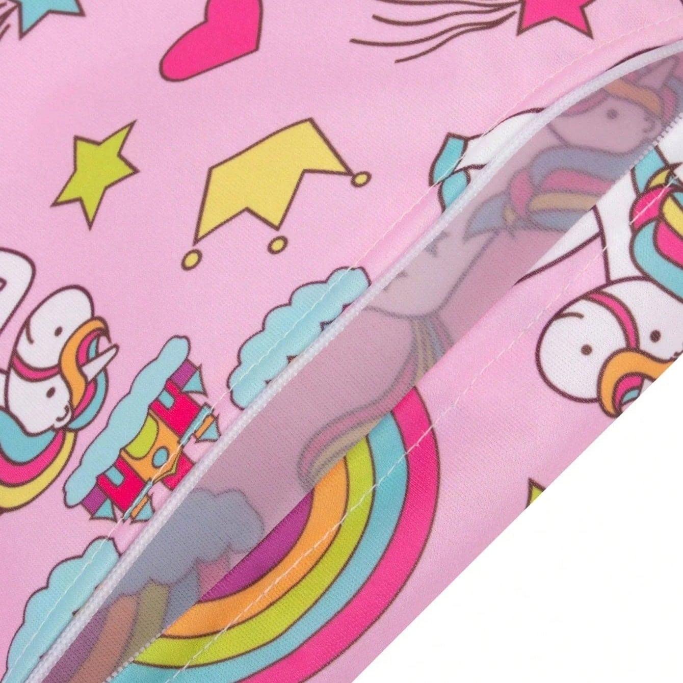 Le fond rose vif est recouvert d’un imprimé joyeux et coloré avec des licornes blanches qui gambadent sur des arcs-en-ciel, des étoiles dorées, des couronnes et des cœurs roses.