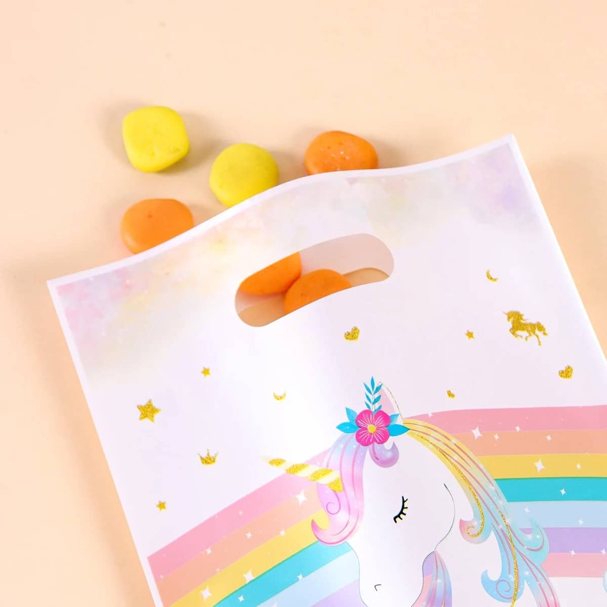 Que ce soit pour remplir des pochettes surprises ou pour offrir des petits cadeaux aux invités en fin de fête, le sachet anniversaire licorne blanc et arc en ciel remplit parfaitement son rôle.