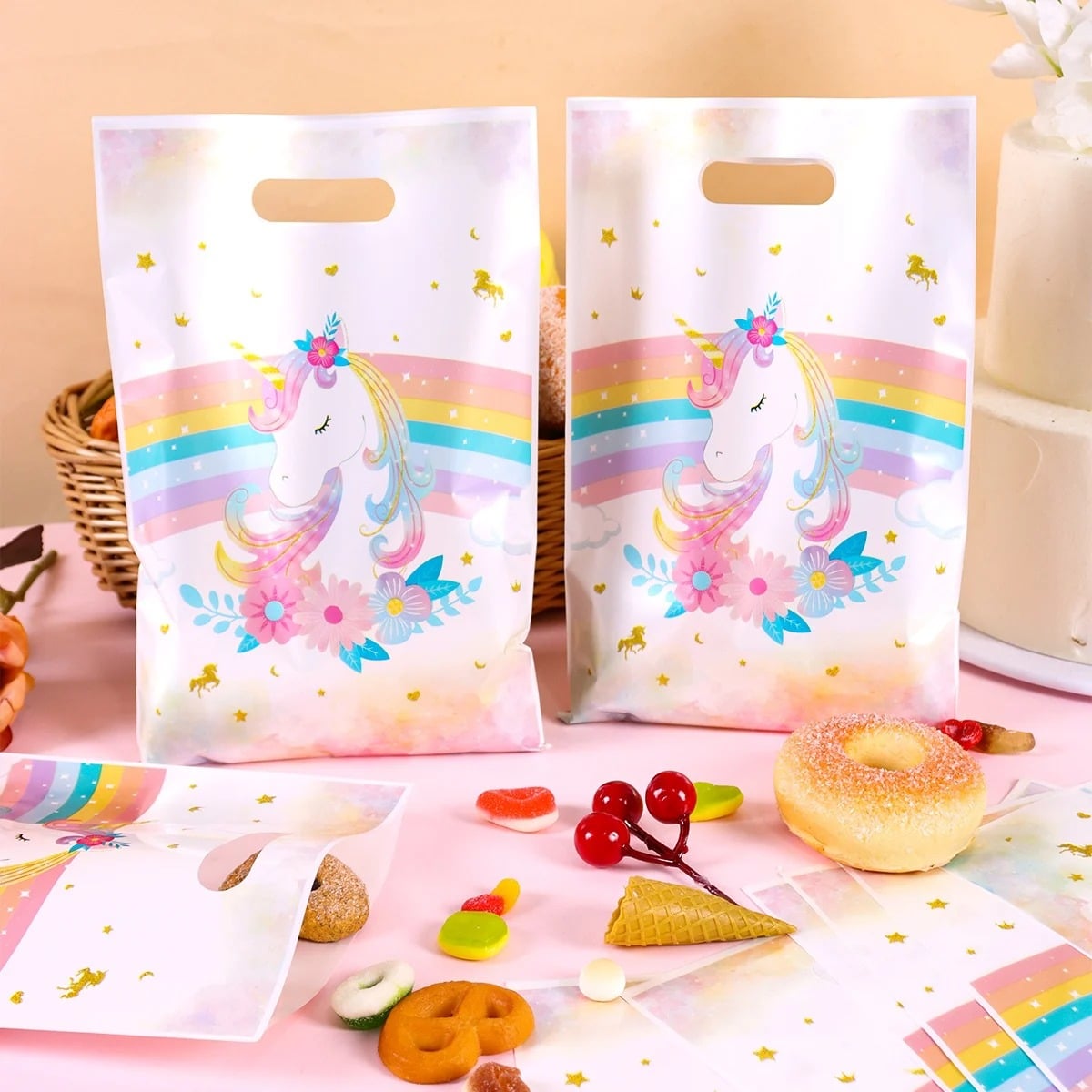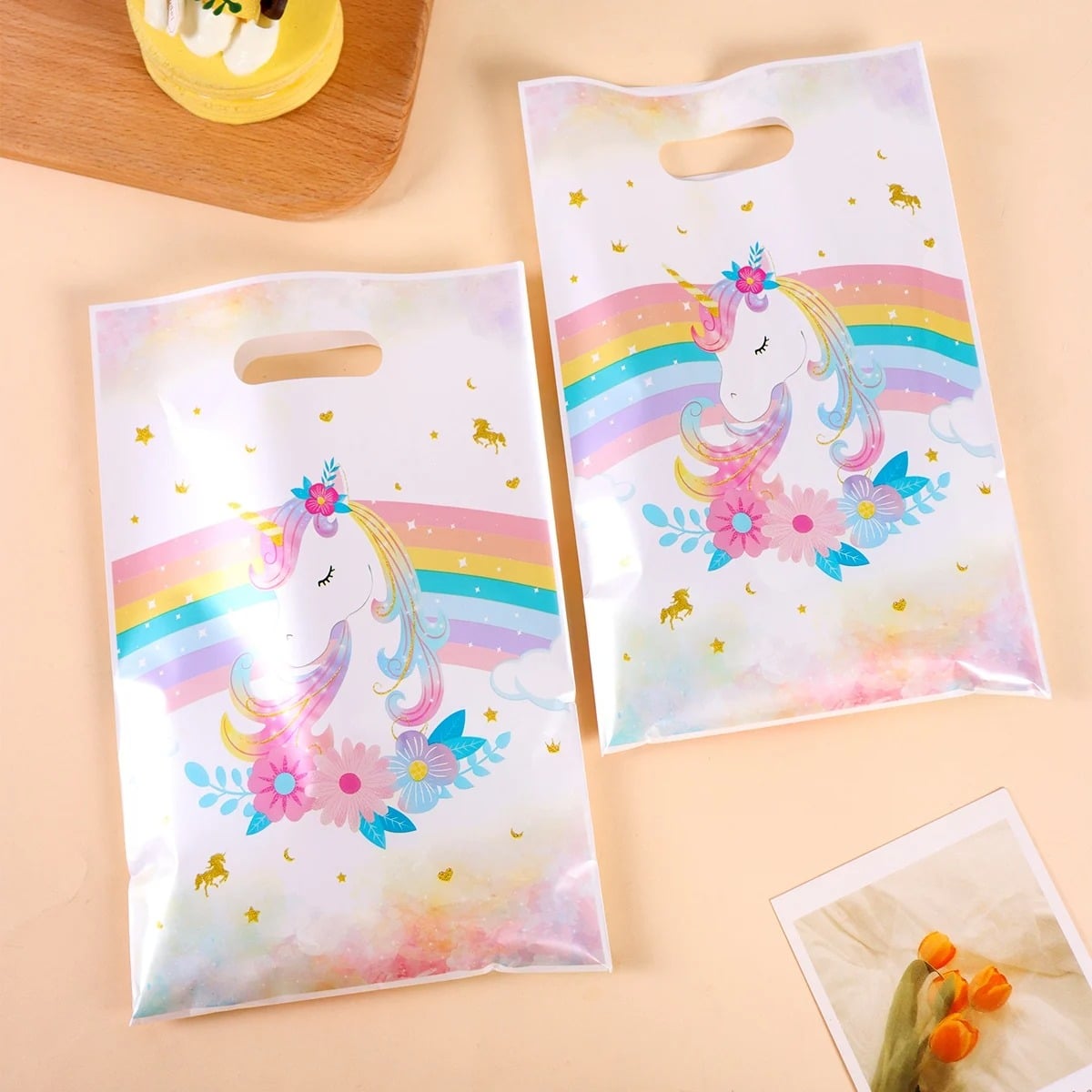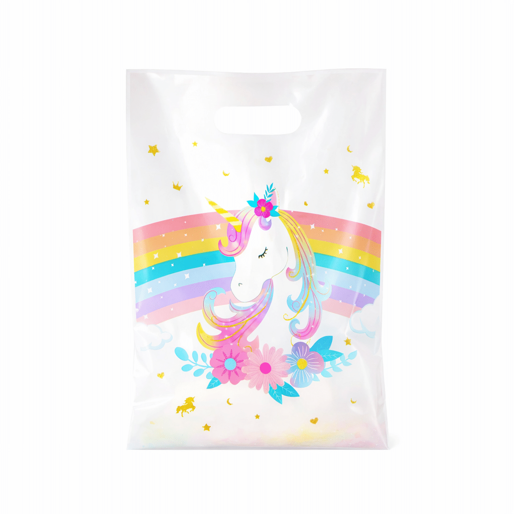 Ces sachets anniversaire licorne blanc et arc en ciel vont transformer chaque table de fête en vrai coin enchanté.