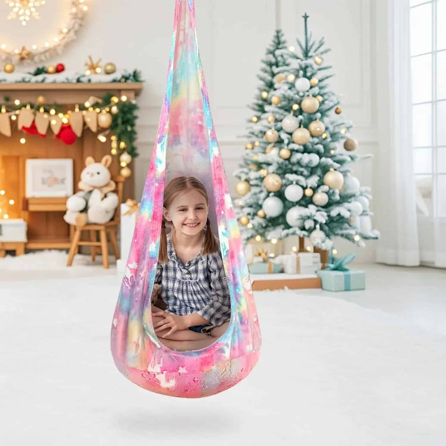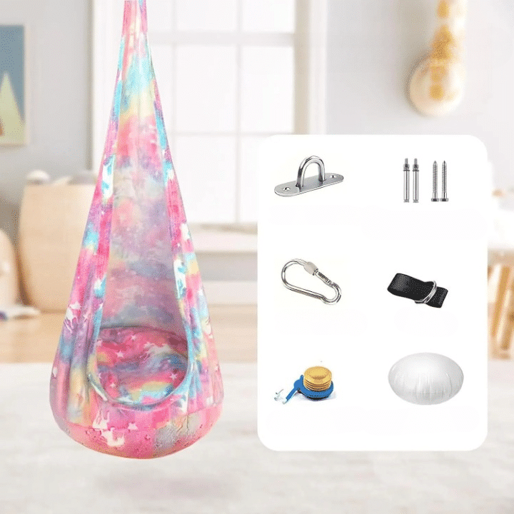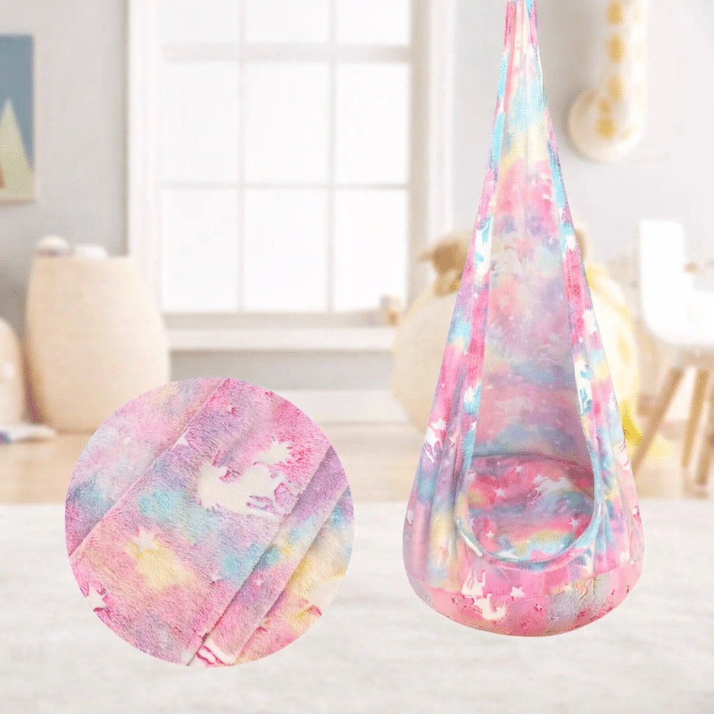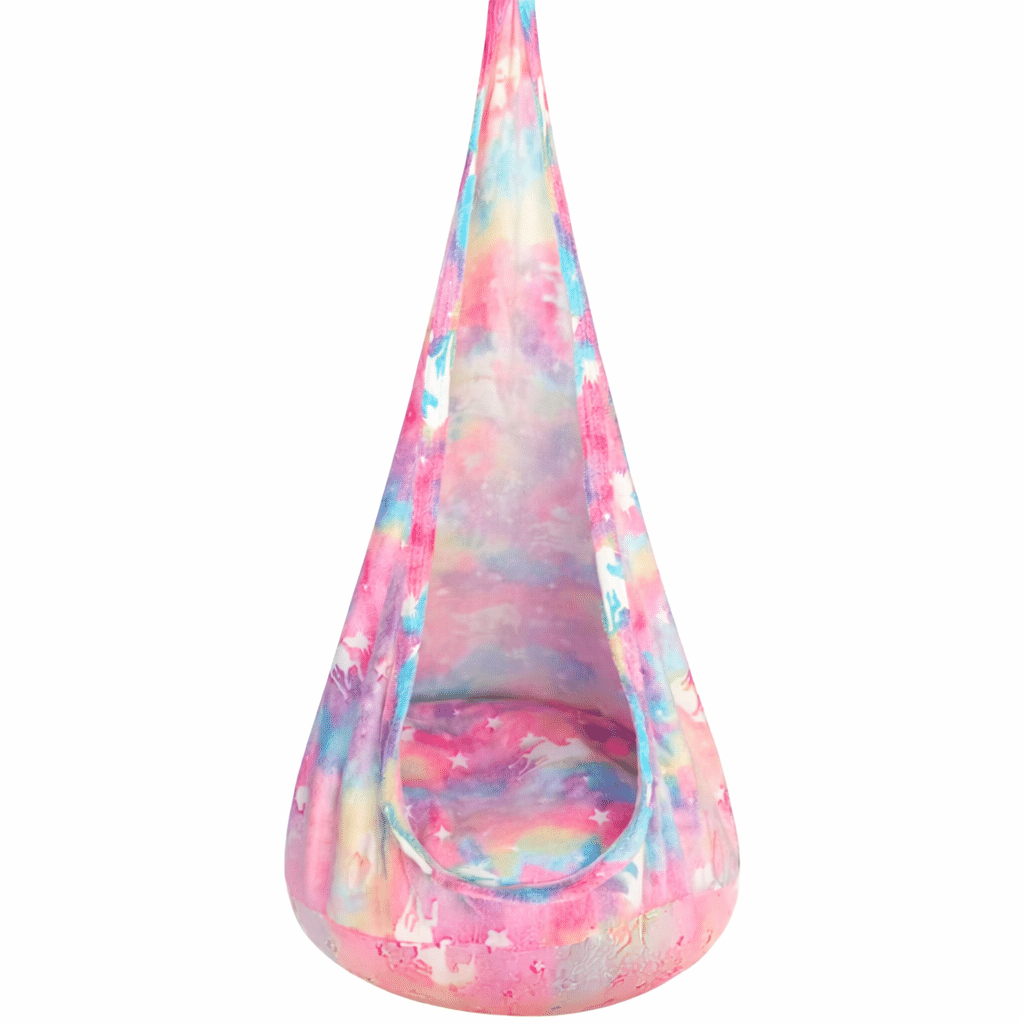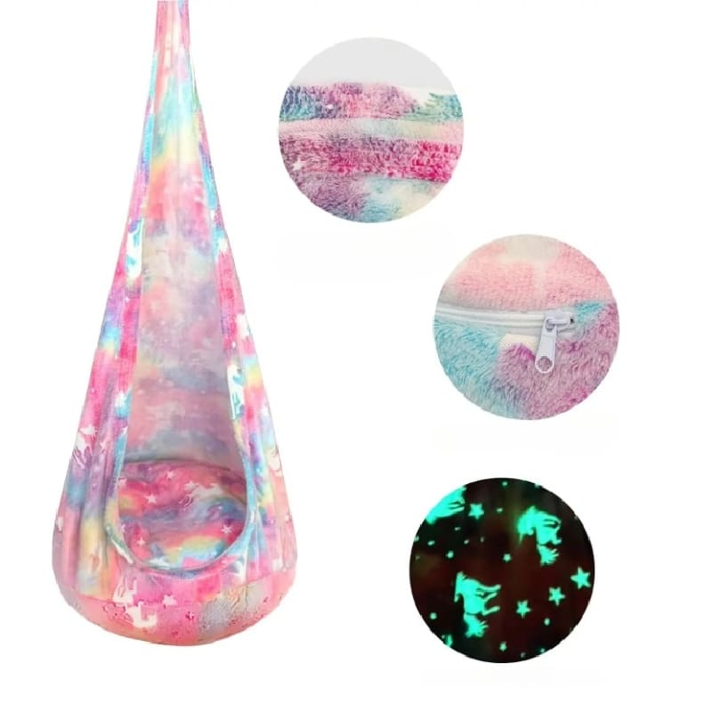 Le siege suspendu balançoire enfant licorne transforme n’importe quel coin de chambre en véritable refuge magique. Sa forme en cocon arrondi, qui s’effile vers le haut comme une goutte suspendue dans les airs, enveloppe l’enfant dans une bulle douillette et rassurante.