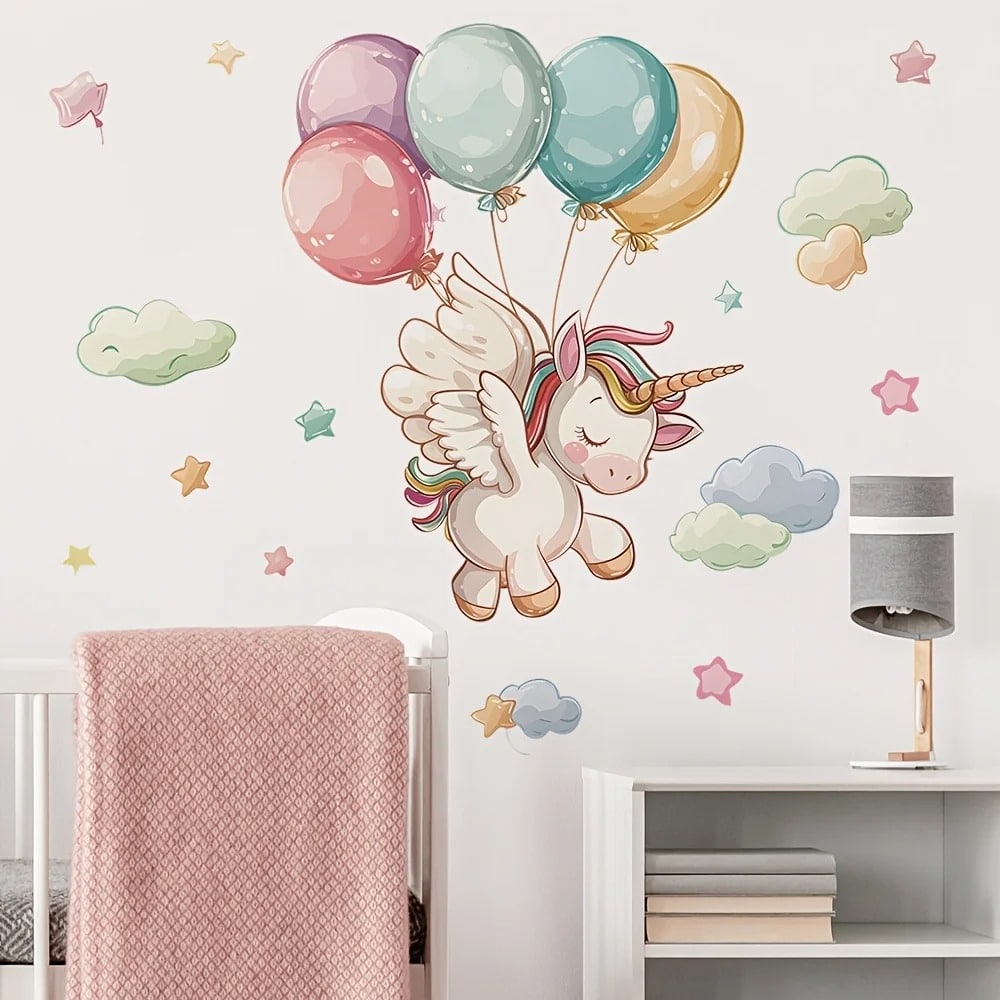 Une licorne aux ailes déployées, portée par des ballons pastel, qui transforme n’importe quel mur en tableau féerique. Ce sticker délicat en 40 x 60 cm se pose et se retire sans effort, pour une magie sans contraintes.