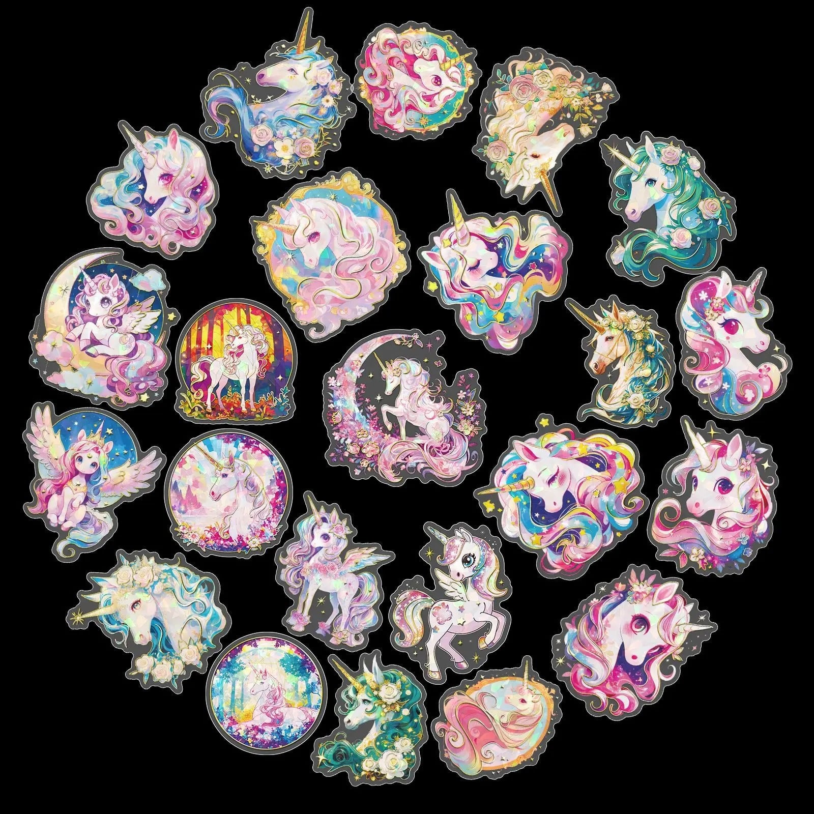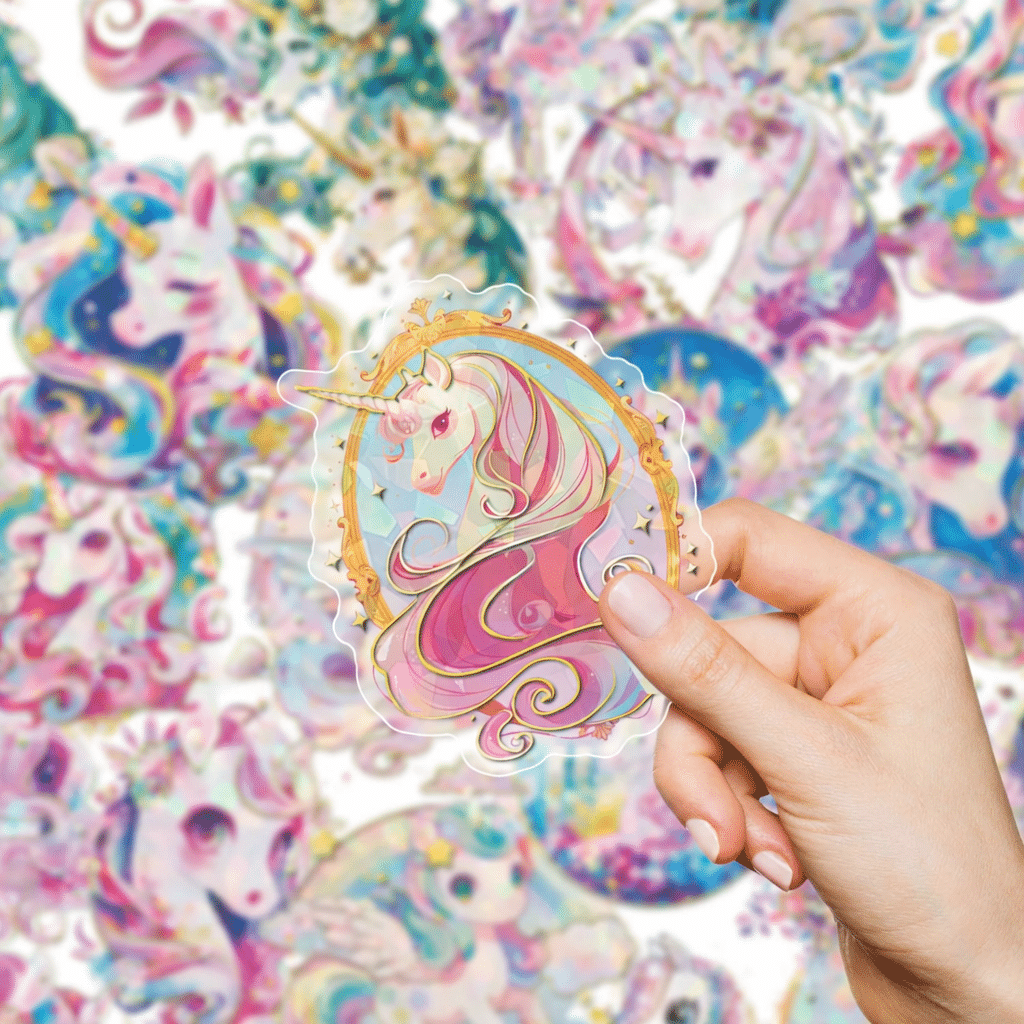 Chaque sticker représente une tête de licorne différente, entourée de fleurs, de nuages, de lunes, d’étoiles et de crinières aux teintes pastel — rose, violet, bleu ciel, doré — le tout dans un style kawaii ultra détaillé qui fait craquer petits et grands.