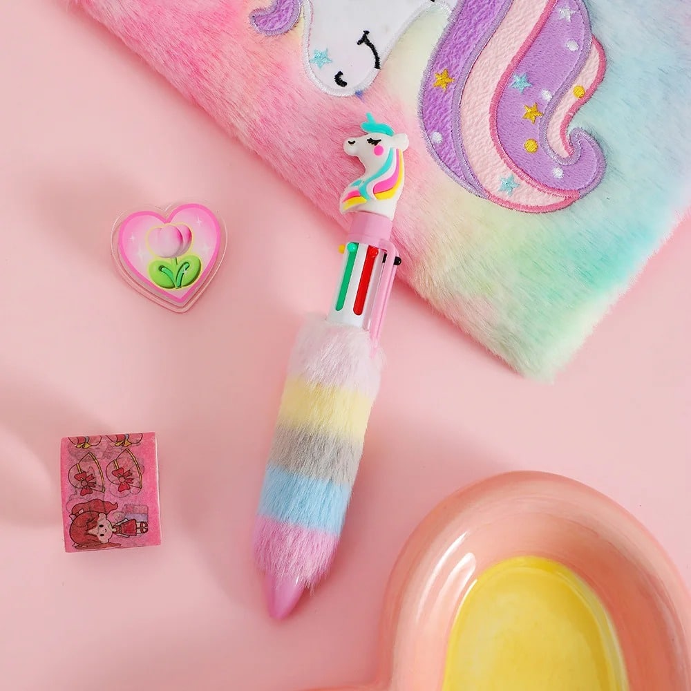 Côté écriture, le stylo licorne fourrure cache une belle surprise : il intègre 6 couleurs d’encre différentes, accessibles en appuyant sur les petits boutons colorés situés en haut du stylo.