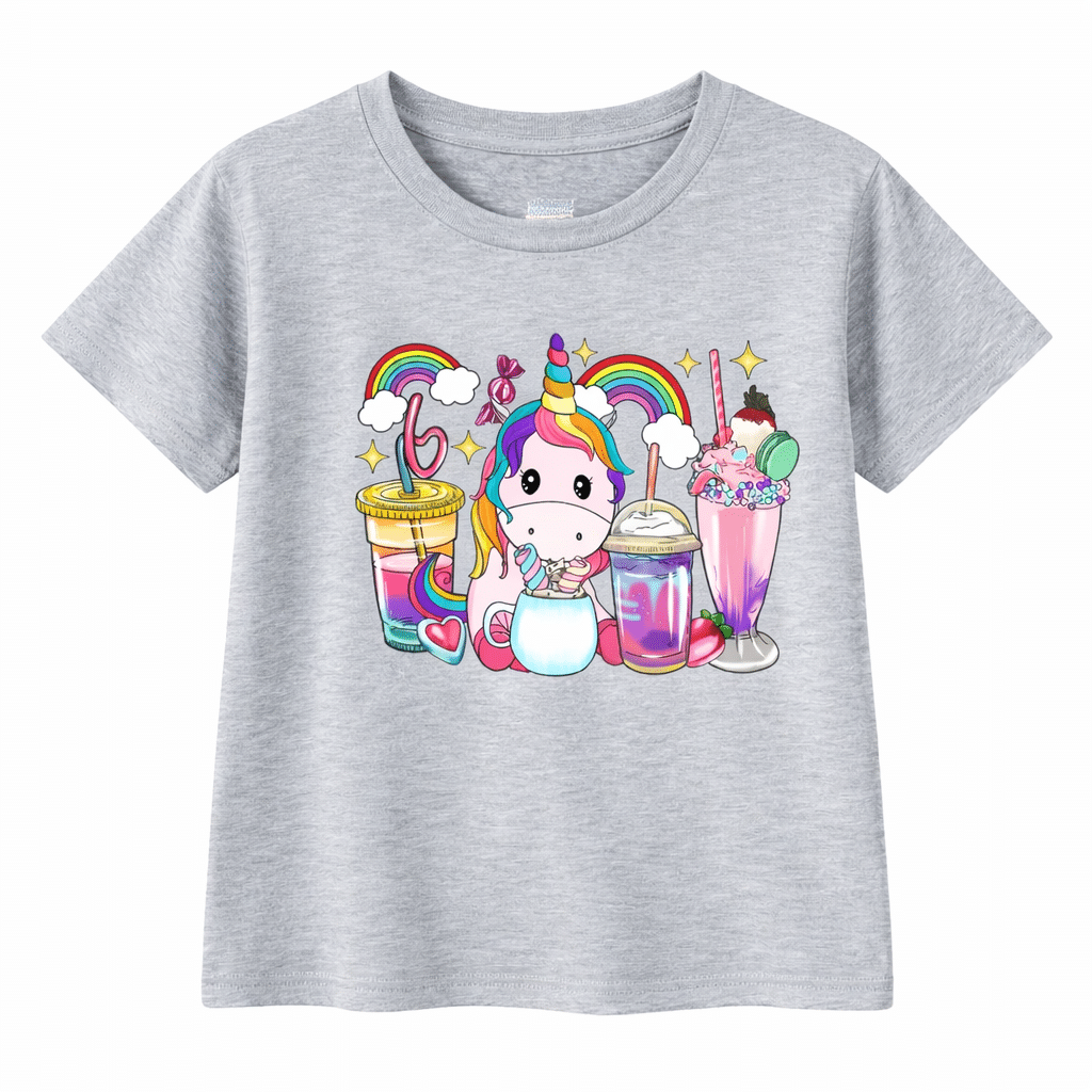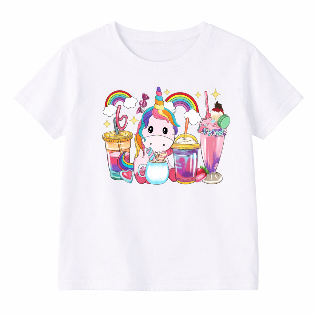 La scène imprimée sur le devant est pleine de vie : on y voit une adorable licorne kawaii entourée de boissons colorées et gourmandes — smoothies, milkshakes et cocktails aux couleurs de l’arc-en-ciel, avec des petits détails rigolos comme des pailles, des cerises et des décorations sucrées.
