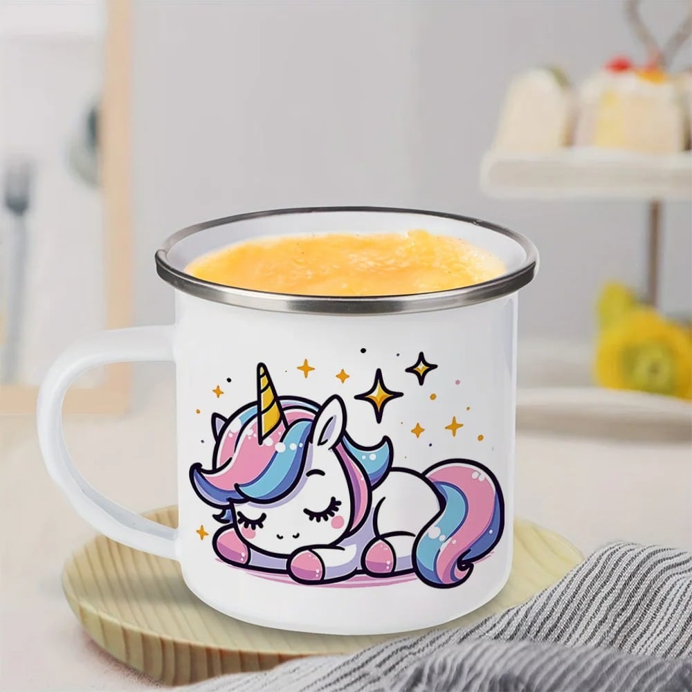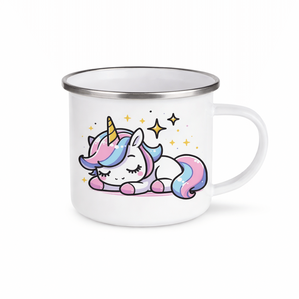 Une tasse en métal robuste et résistante aux chocs, ornée d’une adorable licorne endormie aux teintes pastel. Un concentré de magie féérique pour sublimer chaque pause café ou thé.