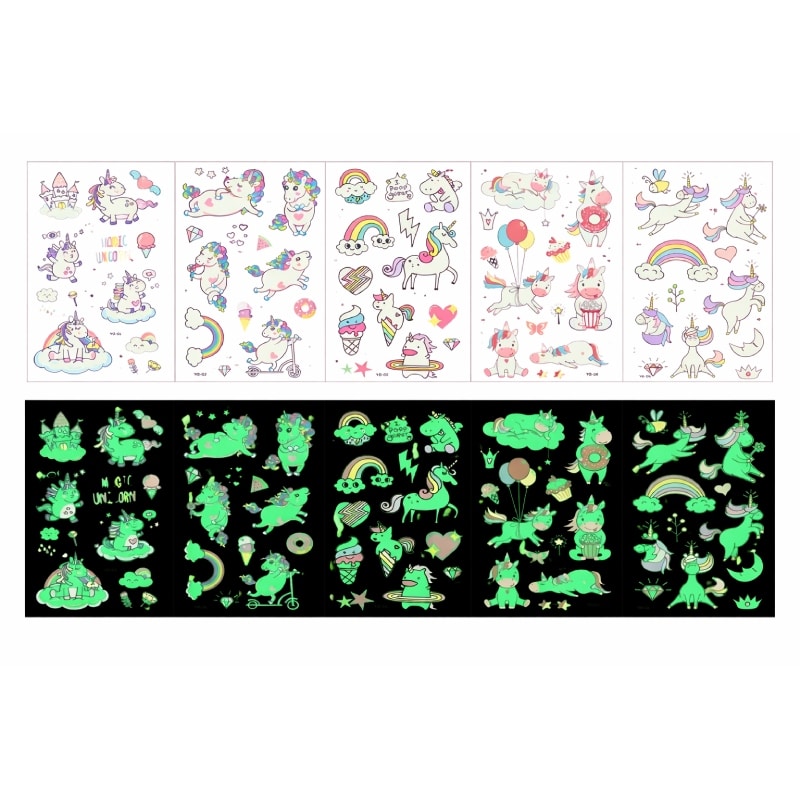 Le tatouage licorne enfant phosphorescent brille dans le noir pour un effet magique qui fait briller les yeux des enfants.