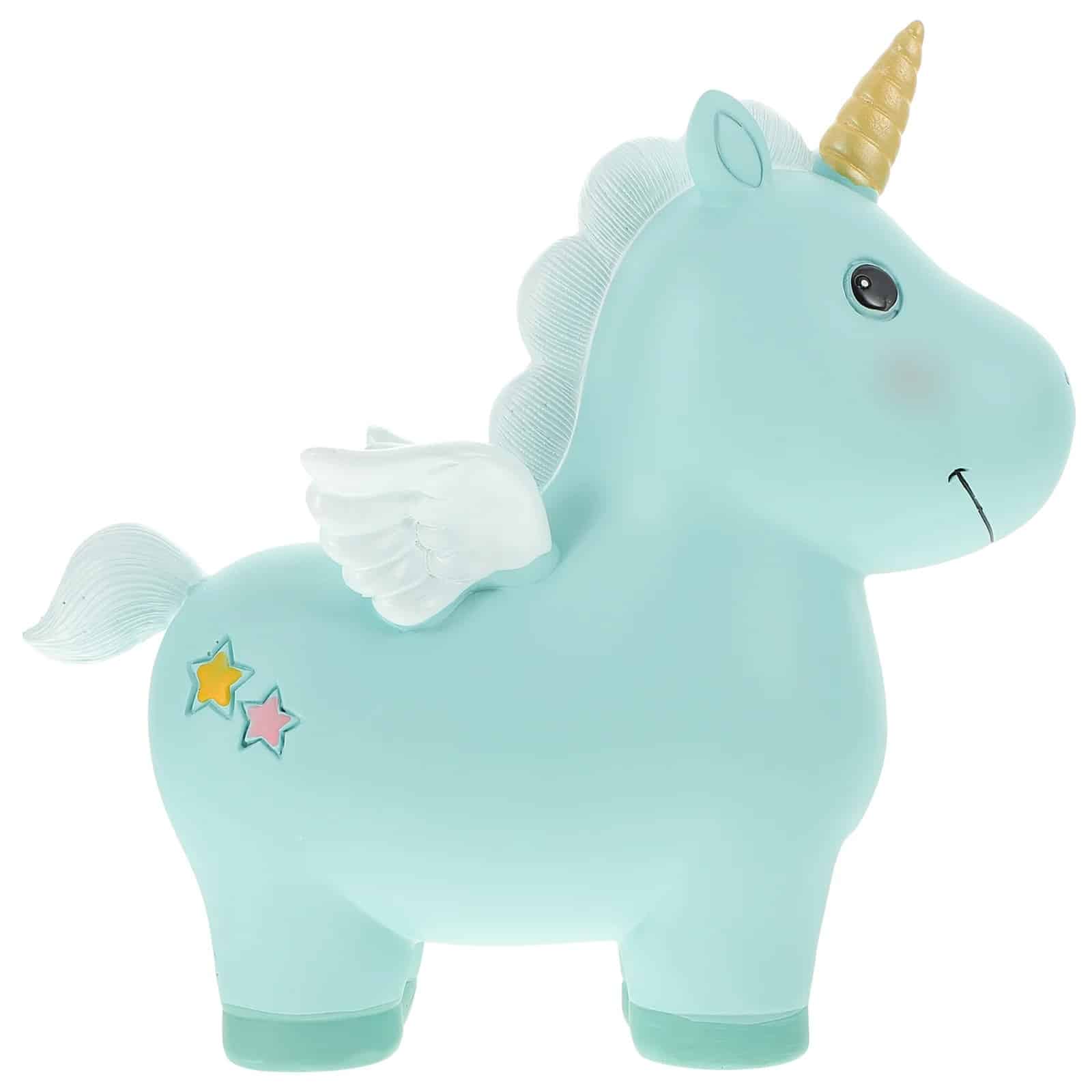 Une tirelire en résine aux allures féeriques, avec sa robe turquoise, sa corne dorée et ses étoiles colorées. Un objet déco plein de charme qui transforme chaque économie en un petit moment de magie.