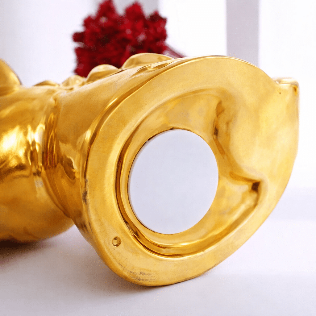 Le rendu doré, légèrement rosé selon la lumière, rappelle une statuette de collection autant qu’une tirelire du quotidien.