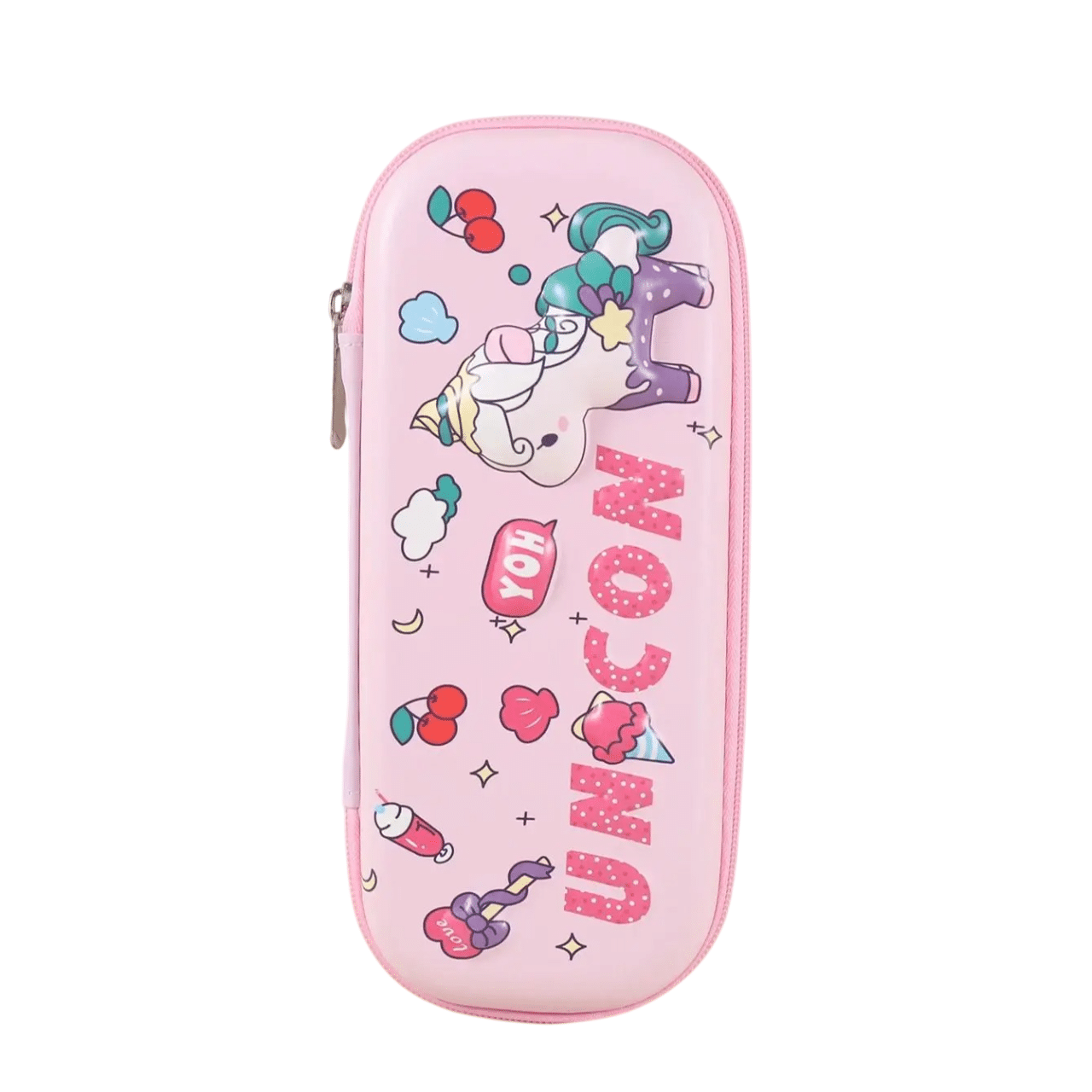 Le design est vraiment adorable : sur fond rose pastel, on retrouve une licorne colorée avec une crinière verte et violette, entourée de petits éléments joyeux comme des cerises, des étoiles et des bonbons.