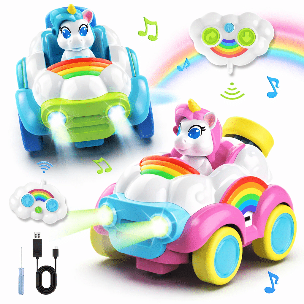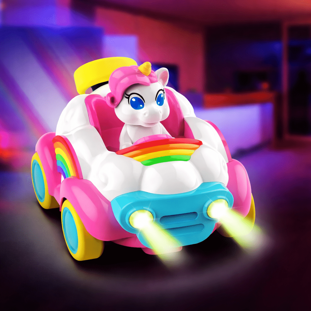 Une voiture télécommandée où la magie des licornes rencontre la vitesse. Avec ses phares lumineux, ses couleurs arc-en-ciel et sa licorne pilote, chaque course devient une aventure féerique inoubliable.
